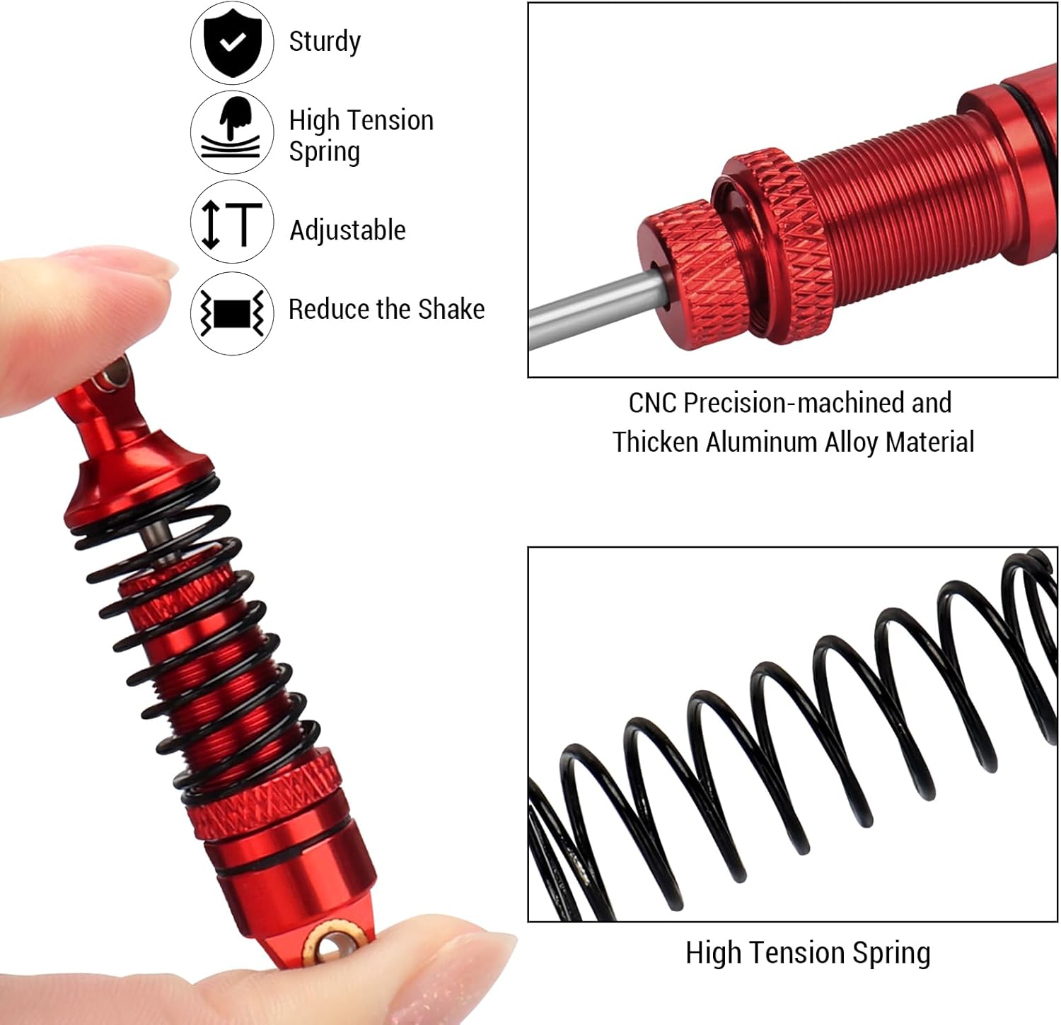 Premium Quality – The RC shock absorber is made of aluminum alloy, it has higher precision and strength. Aluminum material increase crash resistance and long-lasting durability during the most extrem RC action, which can extend the service life of the shock absorber