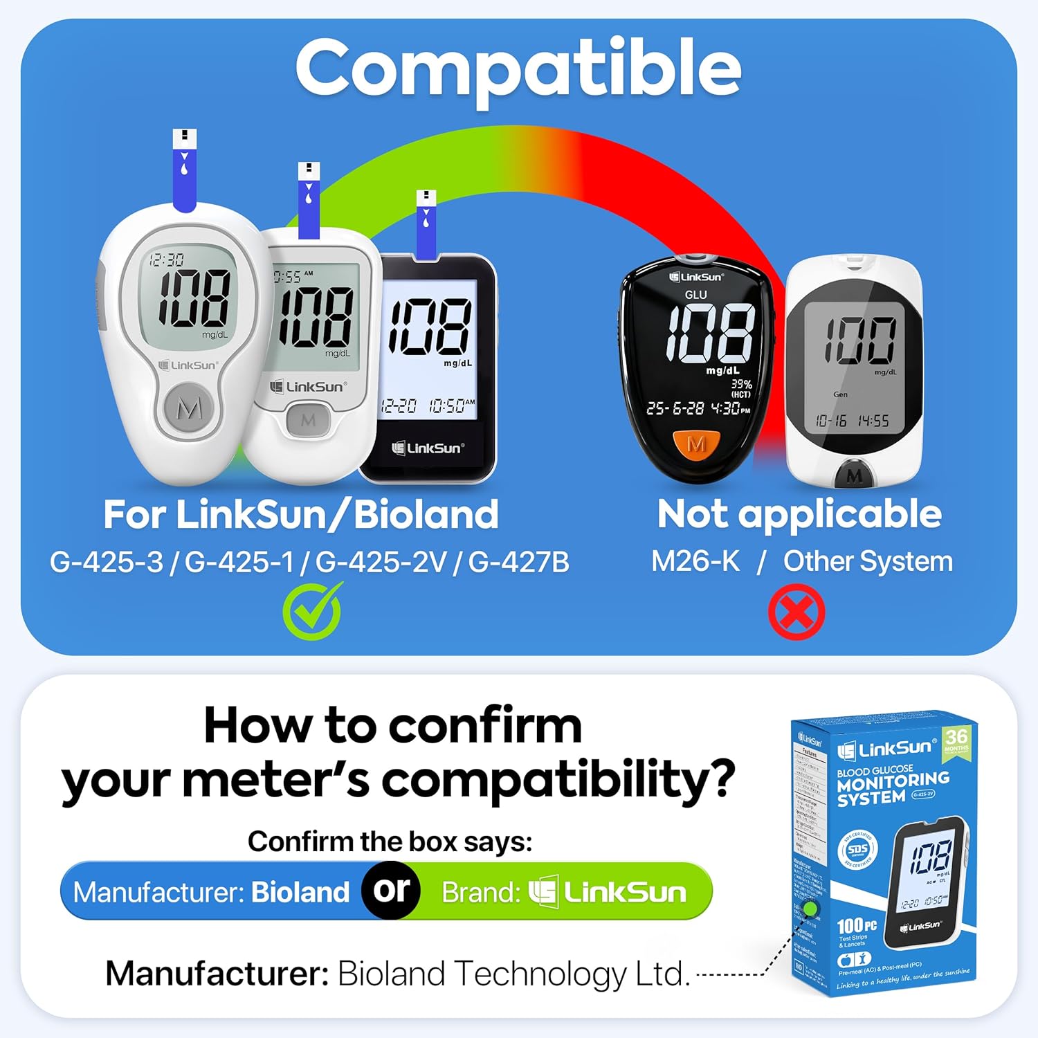 Highly accurate testing: Test strips for use with the LinkSun/Bioland G-425-1/2V/3 & G-427B blood glucose meters only.(Not compatible with other blood glucose monitor)