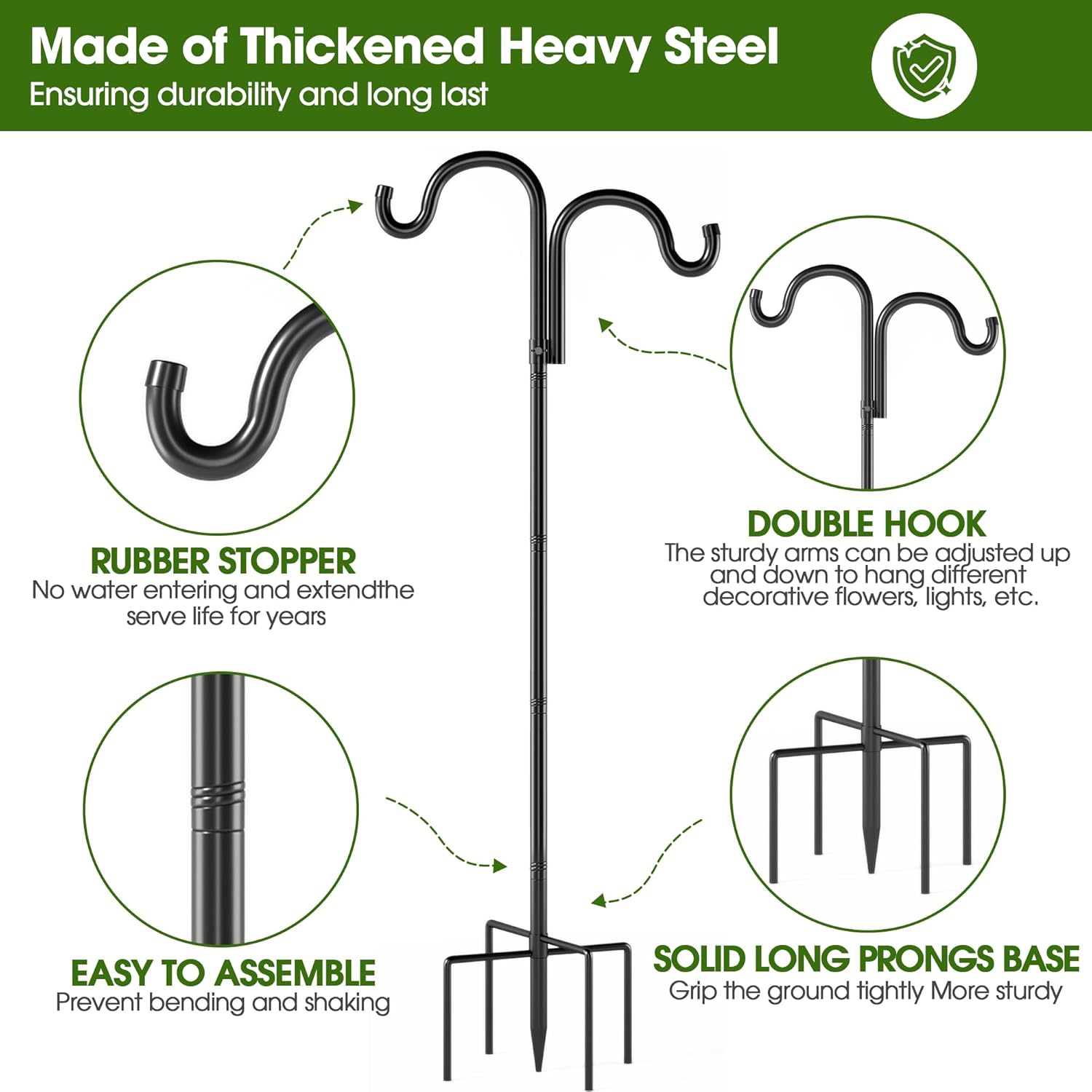 5 Prong Base: The garden hook for outside has been upgraded with 5 forked base prongs. Compared with other hooks that only have 2 or 3 Prongs, tall shepherds’ hooks can maintain a fixed, upright posture while standing firmly planted in the ground without easily falling down