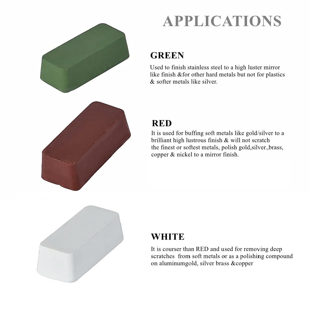 【Color Identified】- Green Fine/White Medium/Red Coarse. The Compounds are color coded for easy identification in a scale from coarse to fine to indicate their level of abrasiveness from coarse to fine to bring out the maximum luster and finish on jewelry and metals to enhance their visual appeal.