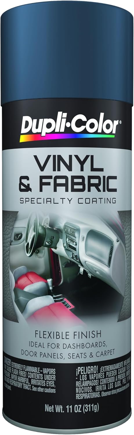 Dupli-Color Vinyl and Fabric Coating Spray Paint is formulated with a maximum adhesion promoter to bond directly to interior components to restore or customize your vinyl and fabric interior. This Medium Blue paint color is known for its high performance; it has a flexible self-priming formula, so it won’t crack, peel or chip. Featuring an easy to use spray nozzle, this spray paint for cars, trucks, motorcycles, SUV’s, ATV’s and UTV’s ensures maximum coverage to give you desired results. Ideal for use on interior vehicle surfaces, Dupli-Color spray paint is perfect for restoring or customizing your interior vinyl seats, dashboards, door panels, shifter boots and consoles. Bring your interior back to life with this interior paint. Before using Fabric and Vinyl Spray, clean surfaces with Dupli-Color Grease & Wax Remover. Mask off areas with tape to keep overspray off the car. Suited for direct application. Be sure to apply in a well-ventilated area. Lay down a light tack coat first, then follow up with two medium coats to build color. It’s dry to the touch in 30 minutes and can be handled in 1 hour.