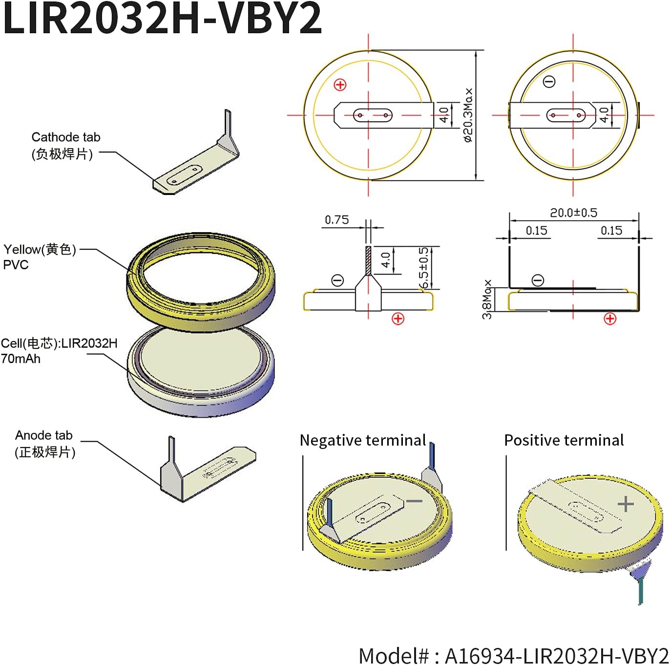 BASIC INFO—VOLTAGE: 3.7V; Capacity: 70mAh; Weight: approximate 3.15g; Diameter: 20mm, Height: 3.2mm. Packing included: LIR2032H Battery with Solder Tabs X 5