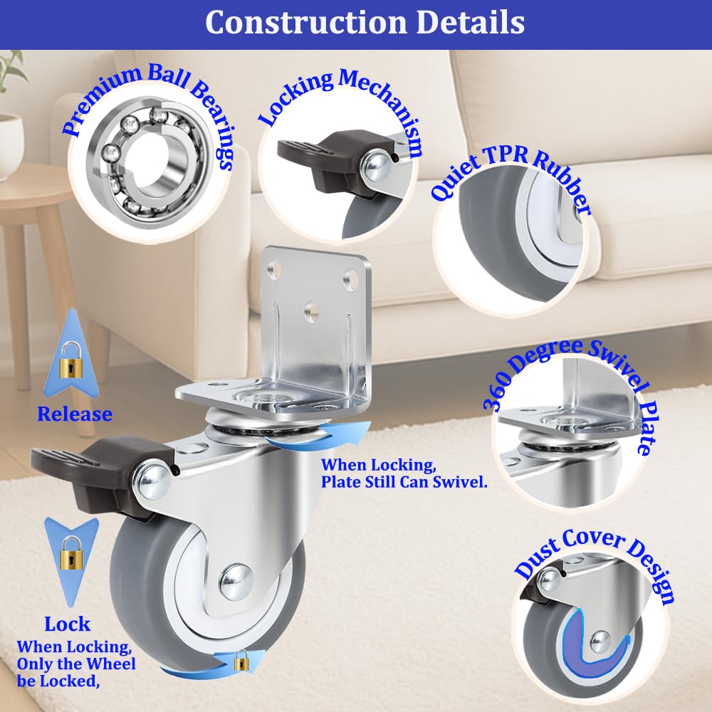 Product Design: 4 lock design offers the perfect blend of mobility and stabilityLoad Capacity: Single caster load capacity of up to 125lbs and a total set capacity of 500lbsMaterial Benefits: Made from high-quality TPR material, these casters are durable, pressure-resistantInstallation Method: The L-bracket mount is a snap to install, no special tools needed.