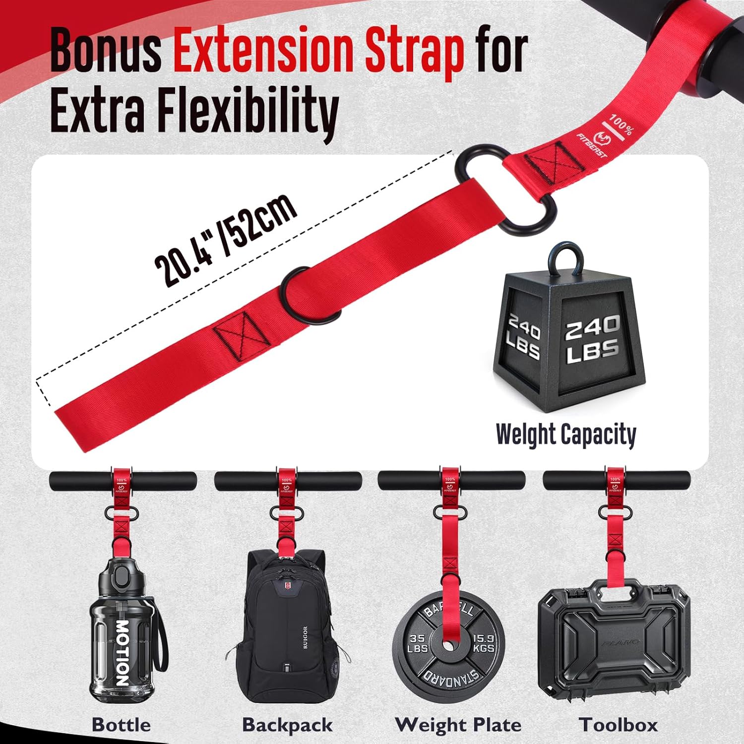 𝗕𝗼𝗻𝘂𝘀 𝗘𝘅𝘁𝗲𝗻𝘀𝗶𝗼𝗻 𝗦𝘁𝗿𝗮𝗽 𝗳𝗼𝗿 𝗘𝘅𝘁𝗿𝗮 𝗧𝗿𝗮𝗶𝗻𝗶𝗻𝗴 𝗙𝗹𝗲𝘅𝗶𝗯𝗶𝗹𝗶𝘁𝘆: The included 20.4″ extension strap enhances your training options by attaching to various objects. Use it with bottles, backpacks, or weight plates to create more dynamic exercises. Suitable for home, gym, or outdoor workouts, offering flexibility anywhere you go.