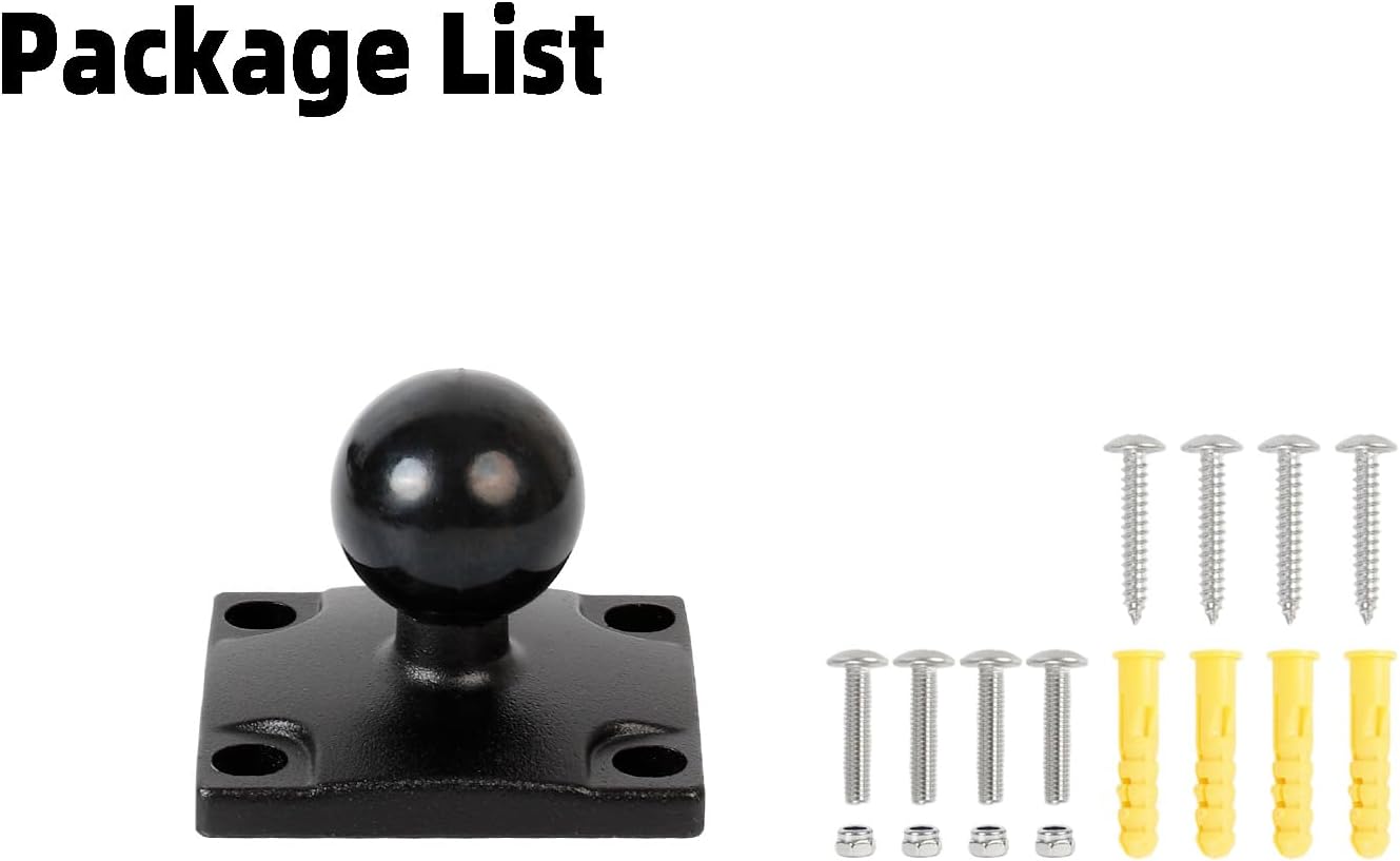 What’s in the Box: Include: 1x 1″ Ball Mount Base with Square Plate, 8x M4 Screws, 4x Nuts, 4x Wall Anchors.