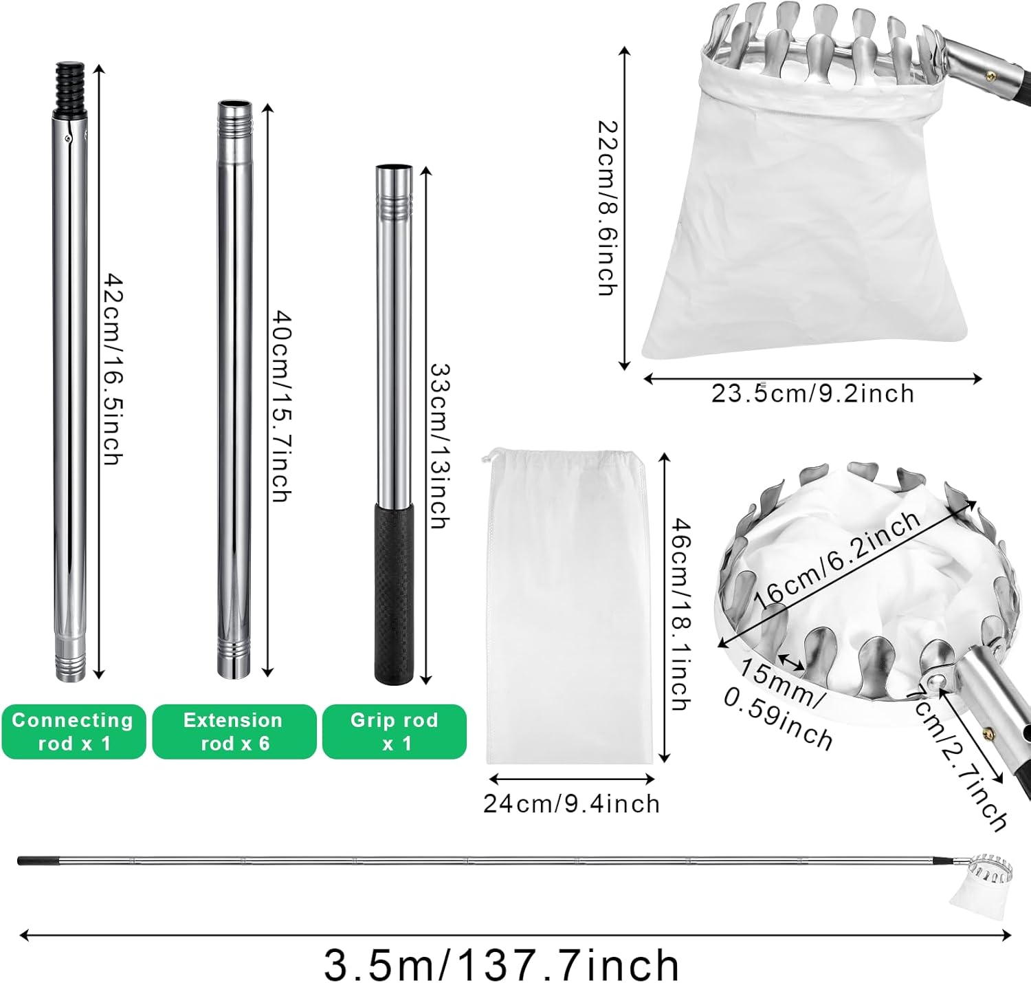 The fruit picking set contains 8 removable stainless steel tubes with a total length of 11.5FT, you can choose the right height according to the height of the picking, and the bag for the fruits is designed with non-woven fabrics, which is durable and won’t harm the fruits at the same time.