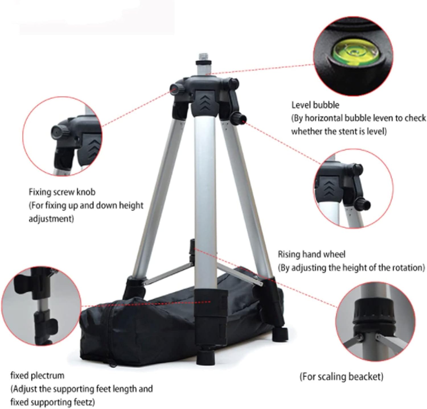 1. EASY TO ADJUST: 3 way articulating head with standard removable quick release plate for free angle adjustment to provide the perfect shooting angle in different conditions.2. WITH BUBBLE LEVEL: Built in bubble level can help you adjust the accuracy to provide maximum accuracy for measurement, suitable for most automatic leveling levels.3. GOOD STABILITY: Foot lock and non slip pad design, the center column is fixed by rotation, which is convenient for fixing the bracket when the bracket is fully unfolded.4. ALUMINUM ALLOY: This adjustable tripod is made of excellent aluminum alloy material, which is light in weight, wear and c orrosion resistant, and has a long service life.5. WITH STORAGE BAG: Portable design self leveling tripod, the legs of the stand can be folded, and equipped with a storage bag for easy carrying and storage.Spec:Item Type: Level TripodMaterial: ABS + Aluminum AlloyColor: SilverScrew: 5/8inWeight: Approx. 20KG / 44lbProduct Size: After Stretching Highest: Approx. 1.5 meter / 4.9ftAfter Retraction: Approx. 55cm / 21.7inpacking list:1 x Tripod1 x Storage BagNote:There is slight error in the size.