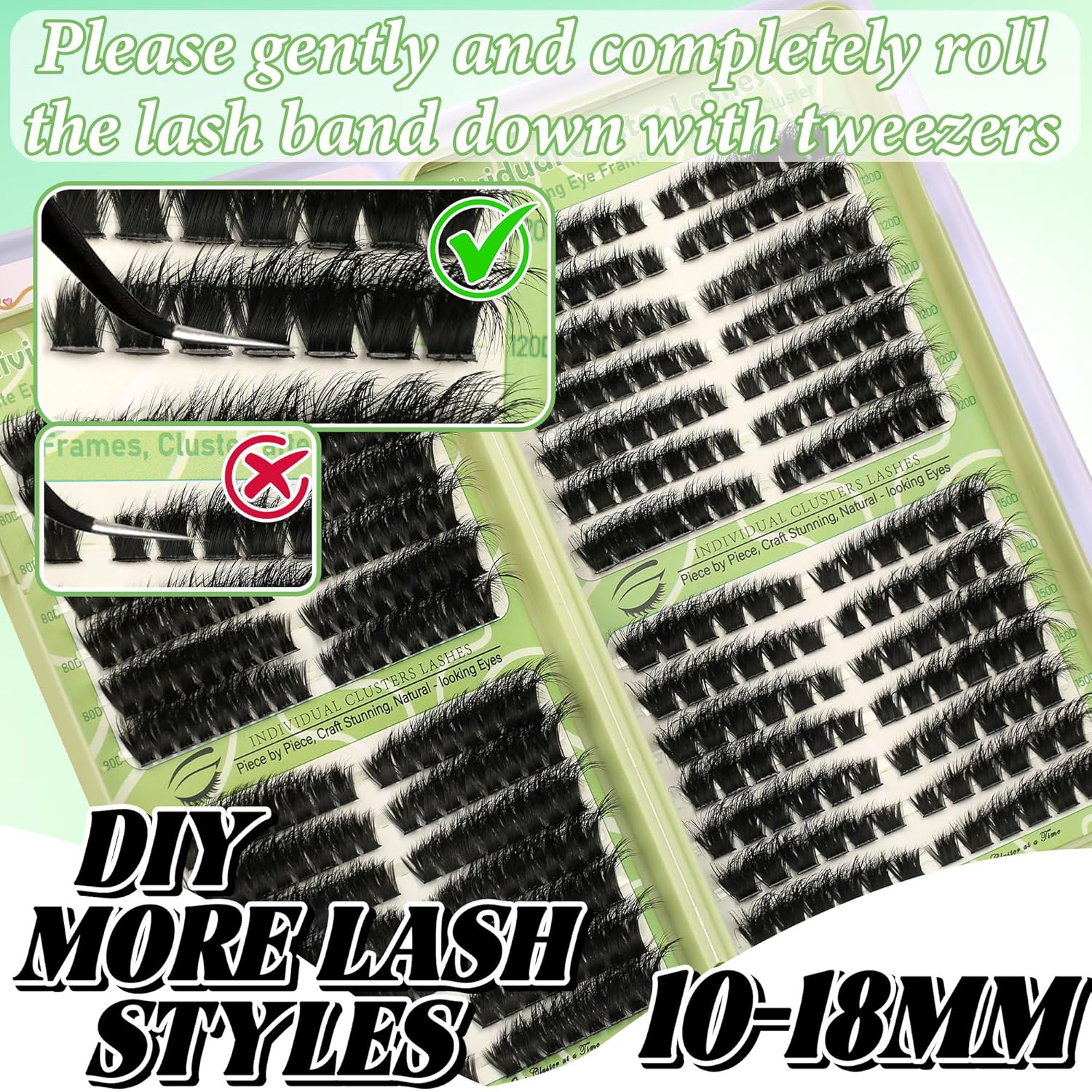 Application tips – Firstly, gently roll the lash band down with tweezers; then apply lash bond on your natural eyelashes; next place the lash clusters onto your lashes; finally use lash seal brush to lock, a perfect eye make-up is complete