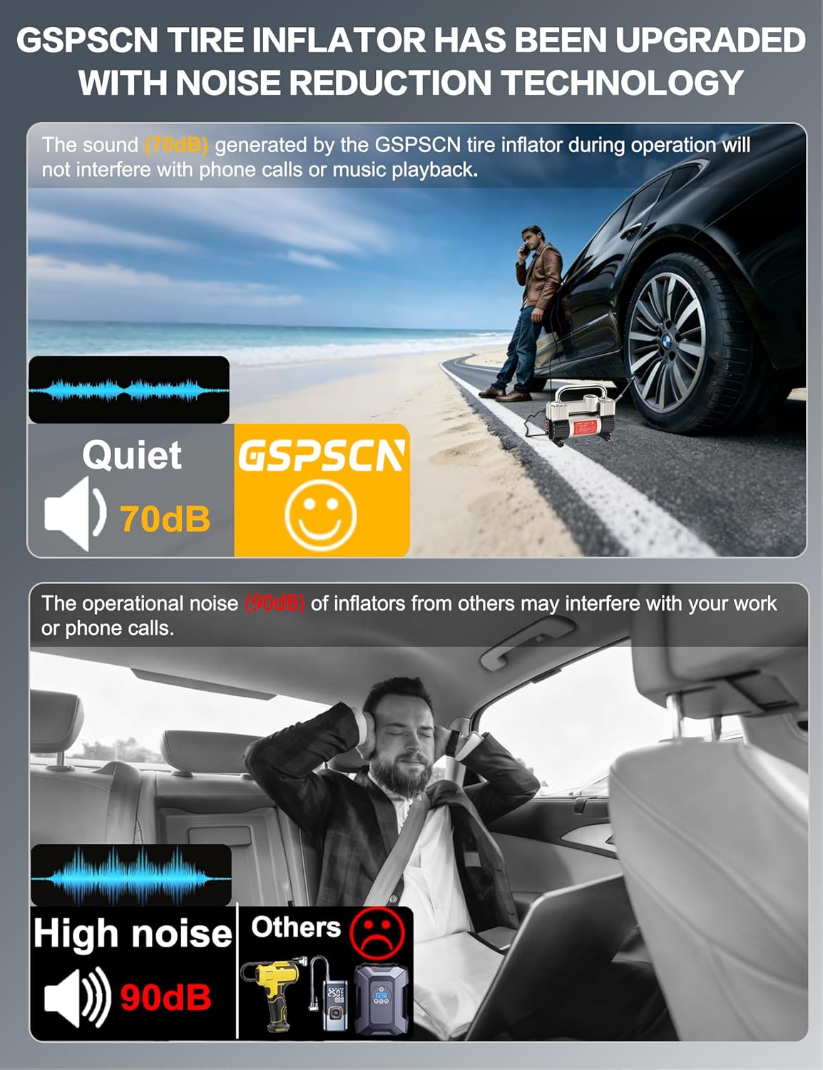 70dB WHISPER-QUIET INFLATION vs. 90dB COMPETITORS:Cut noise by 20dB compared to traditional loud tire inflators! Our precision-tuned design runs as quietly as a normal conversation, so you can inflate tires at night or camp without disturbing neighbors or your family.