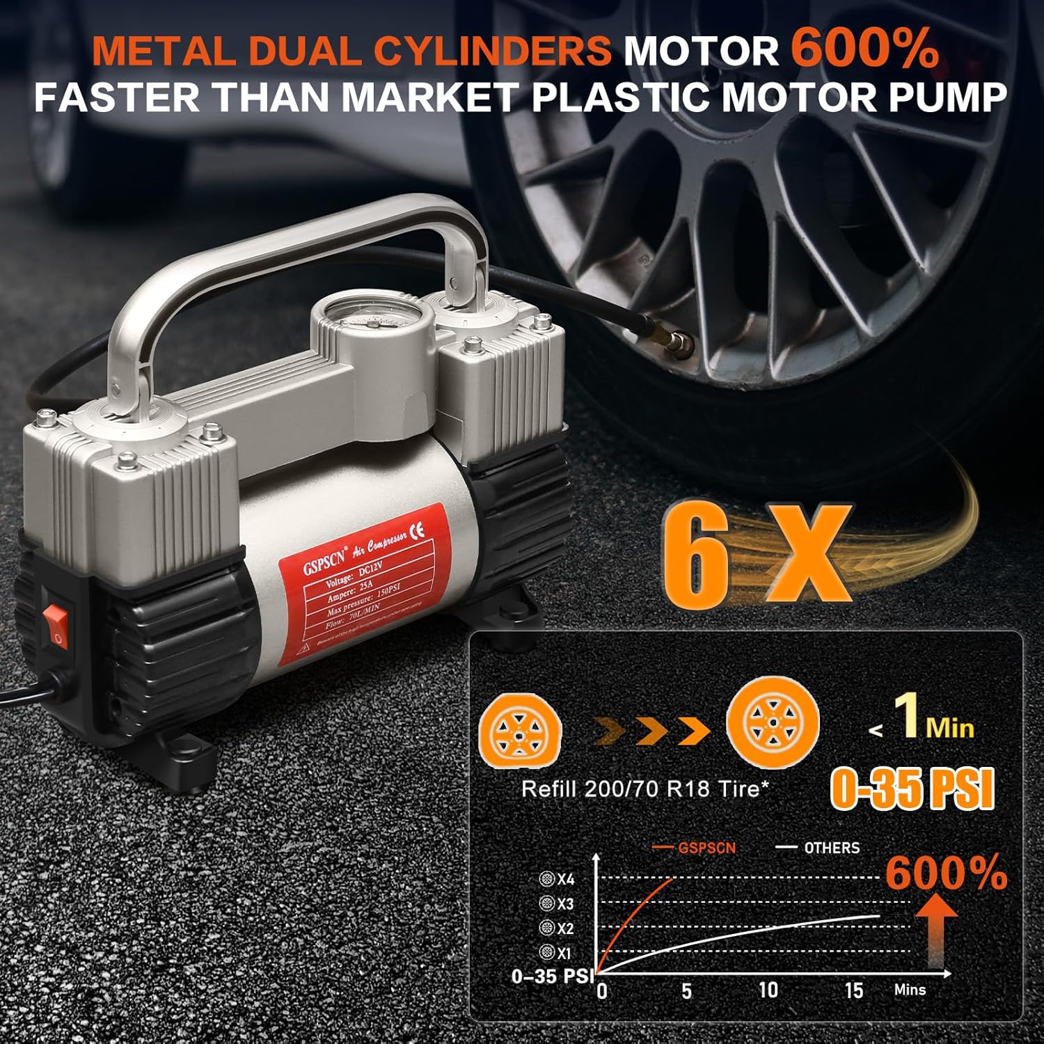 6X FASTER INFLATION: GSPSCN Heavy Duty Double cylinder design,maximum pressure 150PSI, air flow 70L/min, inflates standard vehicle tire in 1 minutes (200/70/R18, 0-35psi).