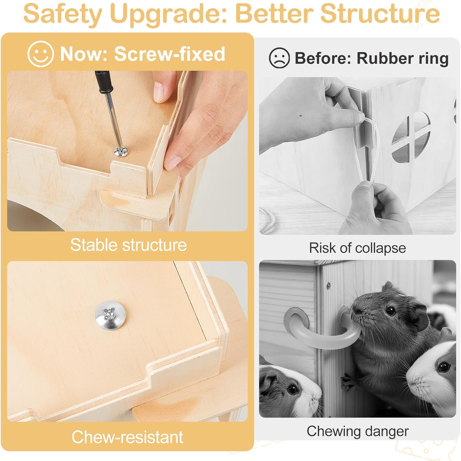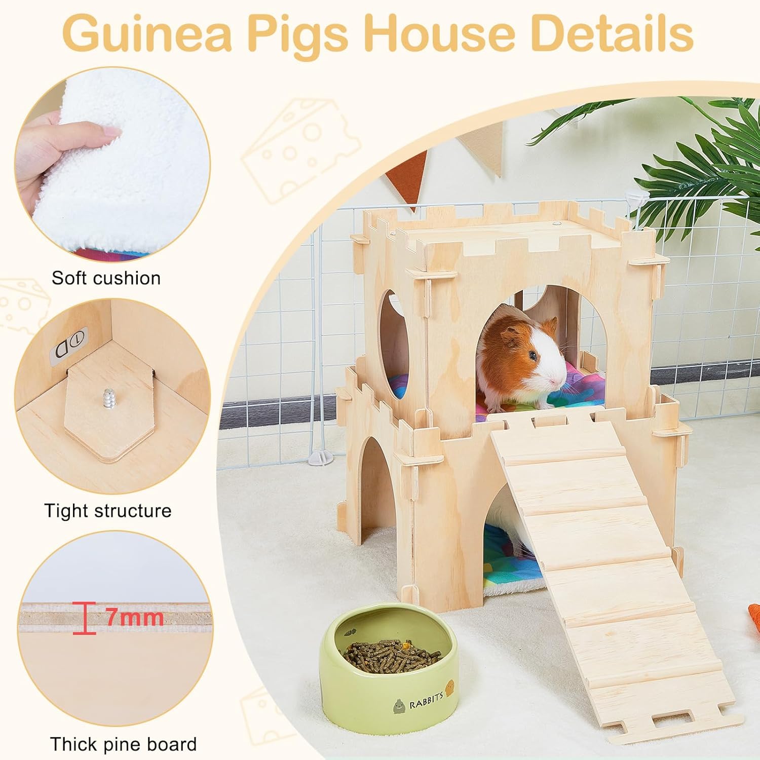 Superior Quality Material: The guinea pig castle is made of pine plywood; Easy to install without glue or nails, avoiding pet injuries; It has structural characteristics such as tight structure, not easy to deform, and strong load-bearing capacity