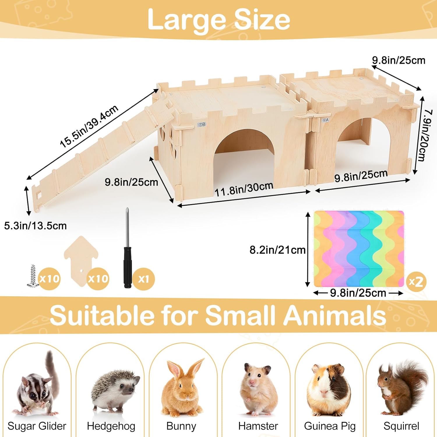 Extra Large Size: The bigger house measures 11.8 x 9.8 x 7.8 in after installation, and the smaller house measures 9.8 x 9 x 7.8 in after installation; Enough space for guinea pigs, bunnies, chinchillas, ferrets and various small animals