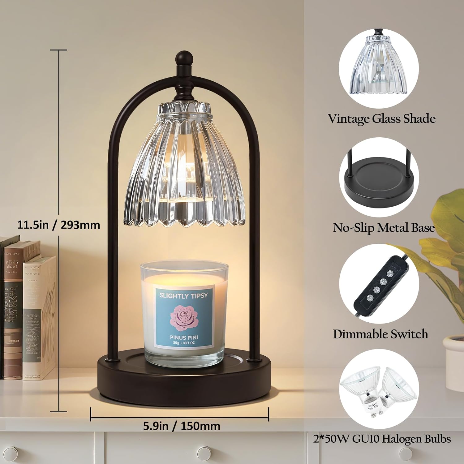 3-Level Dimmable & 8-Hour Timer : Adjust the brightness with 3 dimming levels to control wax melting speed. The built-in timer offers 2H/4H/8H auto-shutoff options, ensuring energy efficiency and safety. Includes 2 x 35W GU10 halogen bulbs.