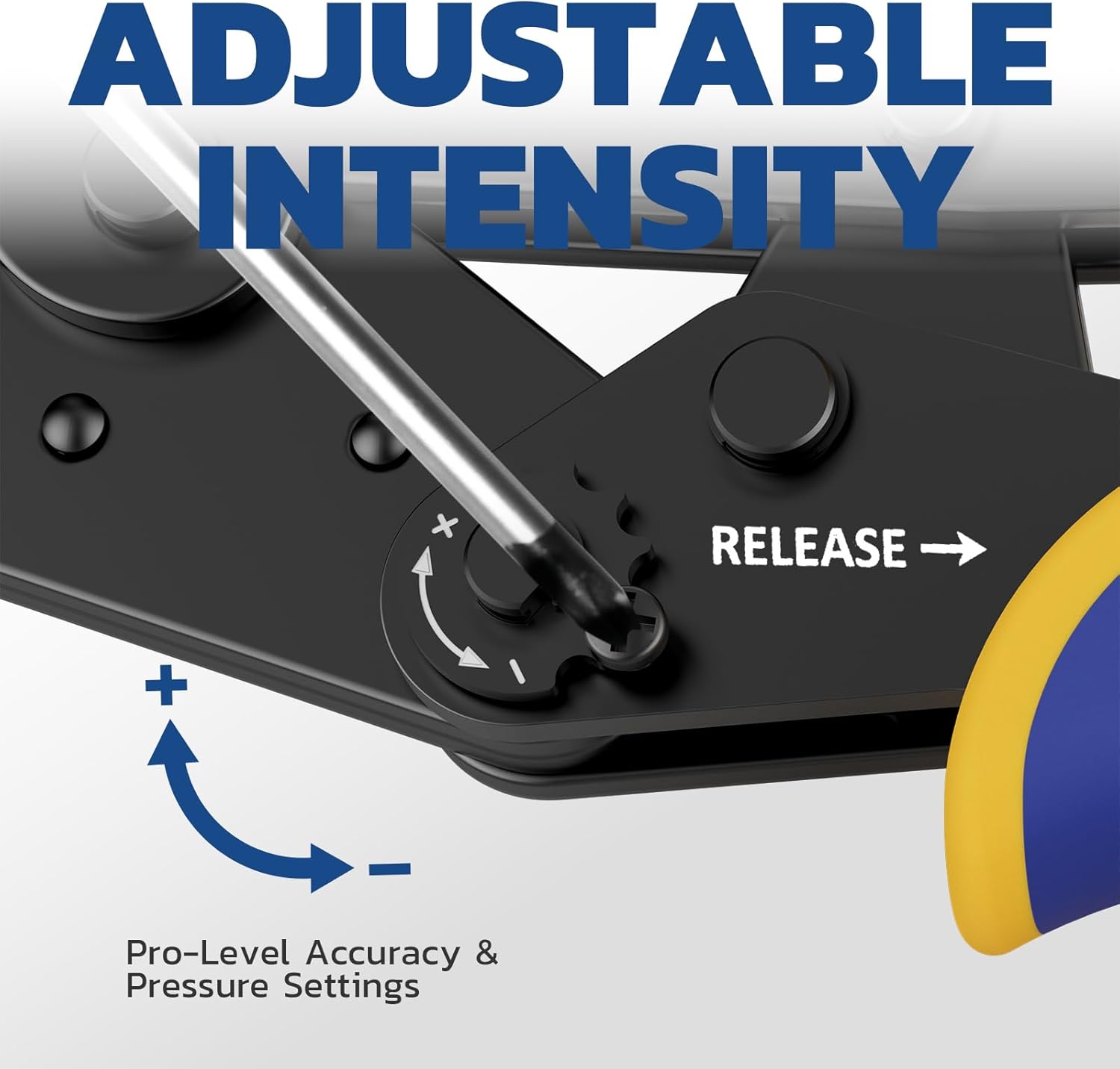 Precise Ratchet Structure-According to the pressure needed to crimp products of different sizes, the built-in thickened ratchet automatically adjusts to the appropriate position to ensure the safe completion of crimping with easy release of the handle. The crimp height of the star wheel is adjustable to ensure the right amount of crimping force.