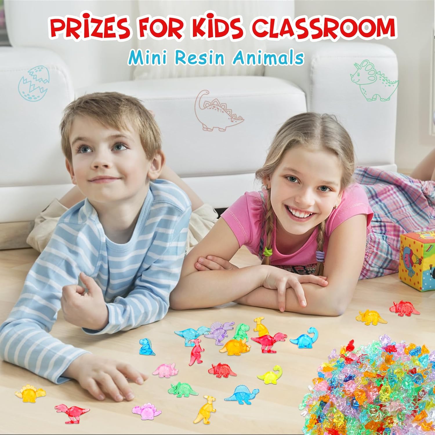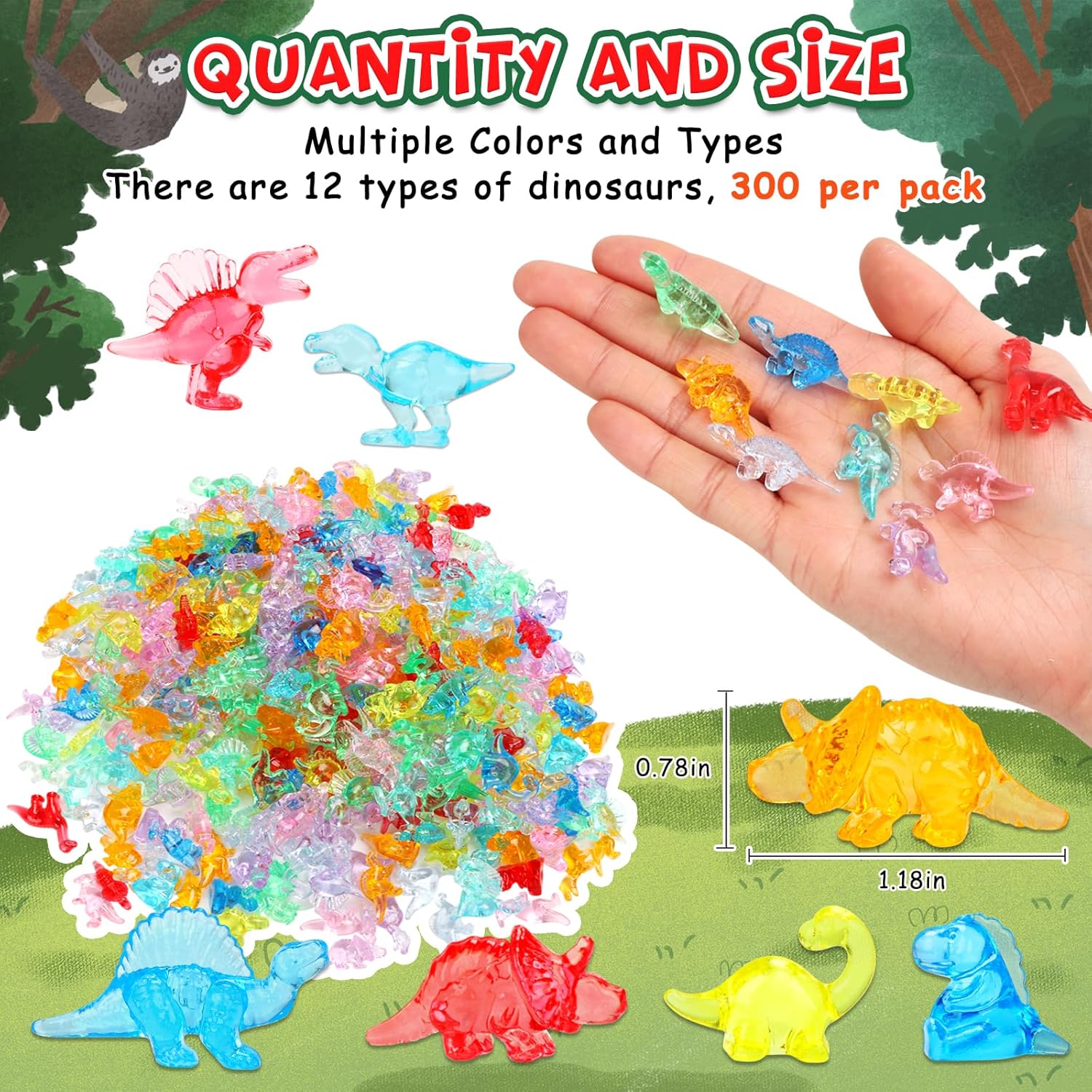 Quantity and Size: Acrylic material is non-toxic and odorless, with no harm to human health. There are 300 tiny dinosaurs with multiple colors in each bag. These tiny dinos are adorable. Each dinosaur is 0.78 – 1.18 inches. They are small in size and easy to carry, making them especially suitable for being placed in Easter eggs, sensory bin and treasure boxes.