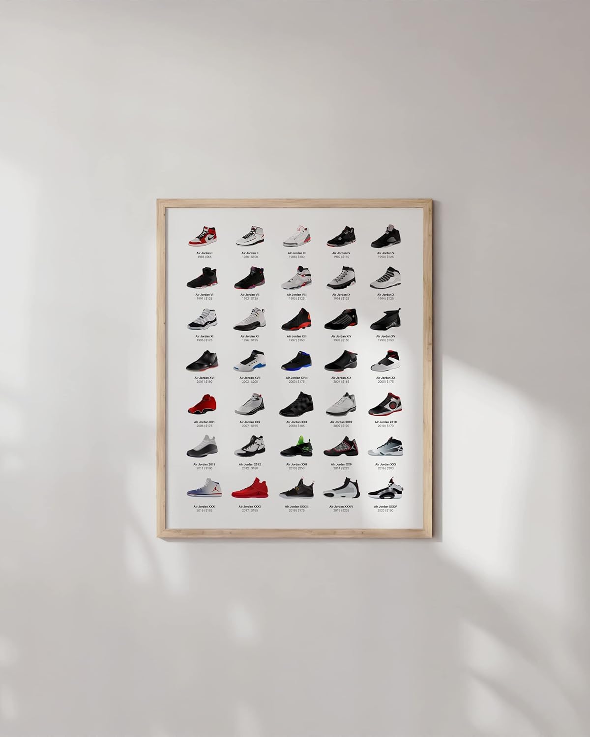 MICHAEL JORDAN SHOE ART POSTERS FOR WALLS: Know any avid sneakerheads? Express your sporty side and show it off to your friends and family as we offer this new Haus and Hues Jordan sneakers poster art print. These hypebeast pictures present the evolution of Jordans throughout time. Also, this Michael Jordan wall art and shoe poster for walls features the now-iconic red, black and white colors that everyone is dying for in high-top, mid, and low cut designs