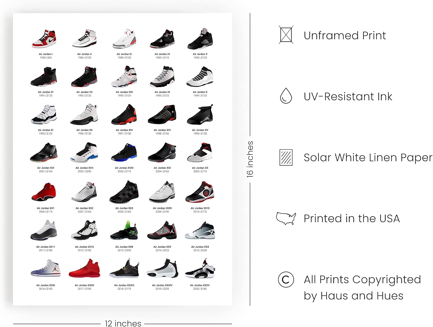RISK-FREE GUARANTEE: Shop Haus & Hues Jordan artwork online with confidence. Customer satisfaction is our top priority when it comes to posters for guys room or wall posters for college dorms. This is made possible by manufacturing our prints in the US with our in-house team that hails from the Wynwood Arts District in Florida, a premier destination for art. If there are any problems with your order, we’re happy to offer a replacement for your sneaker poster wall art