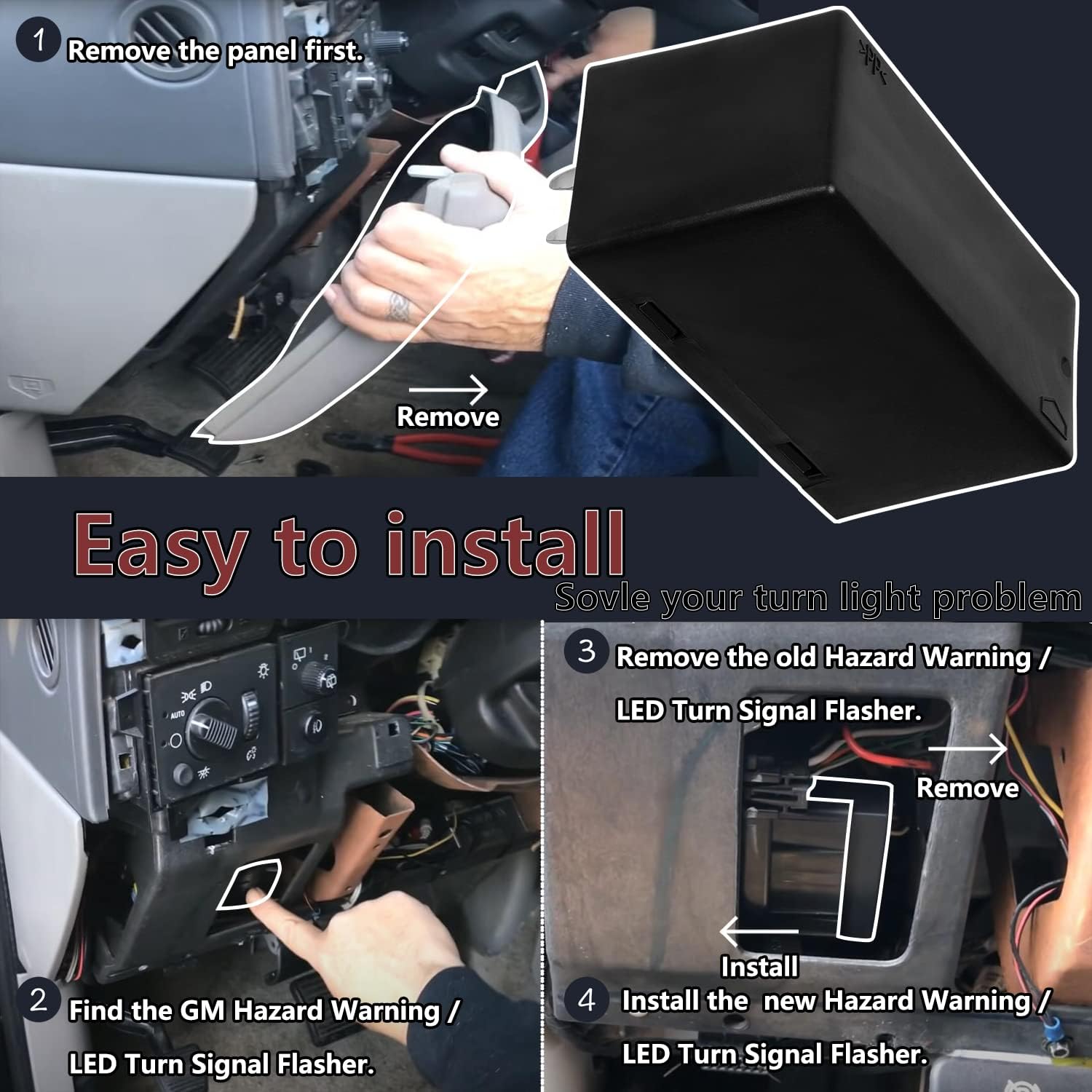 Easy to Install – Simple installation process: 1.Remove the panel to access the Hazard Warning/LED Turn Signal Flasher 2.Remove the old flasher 3.Install the new Hazard Warning/LED Turn Signal Flasher