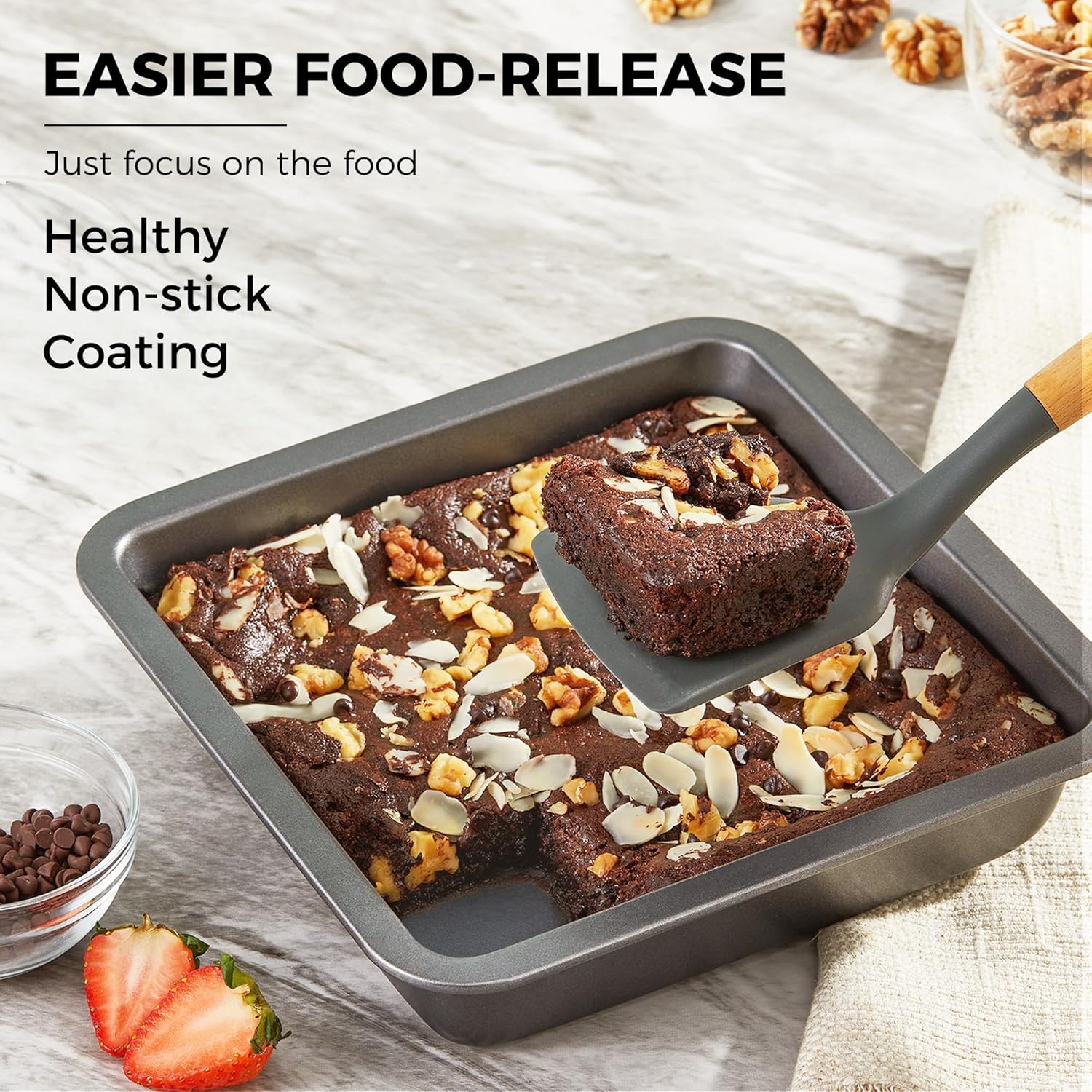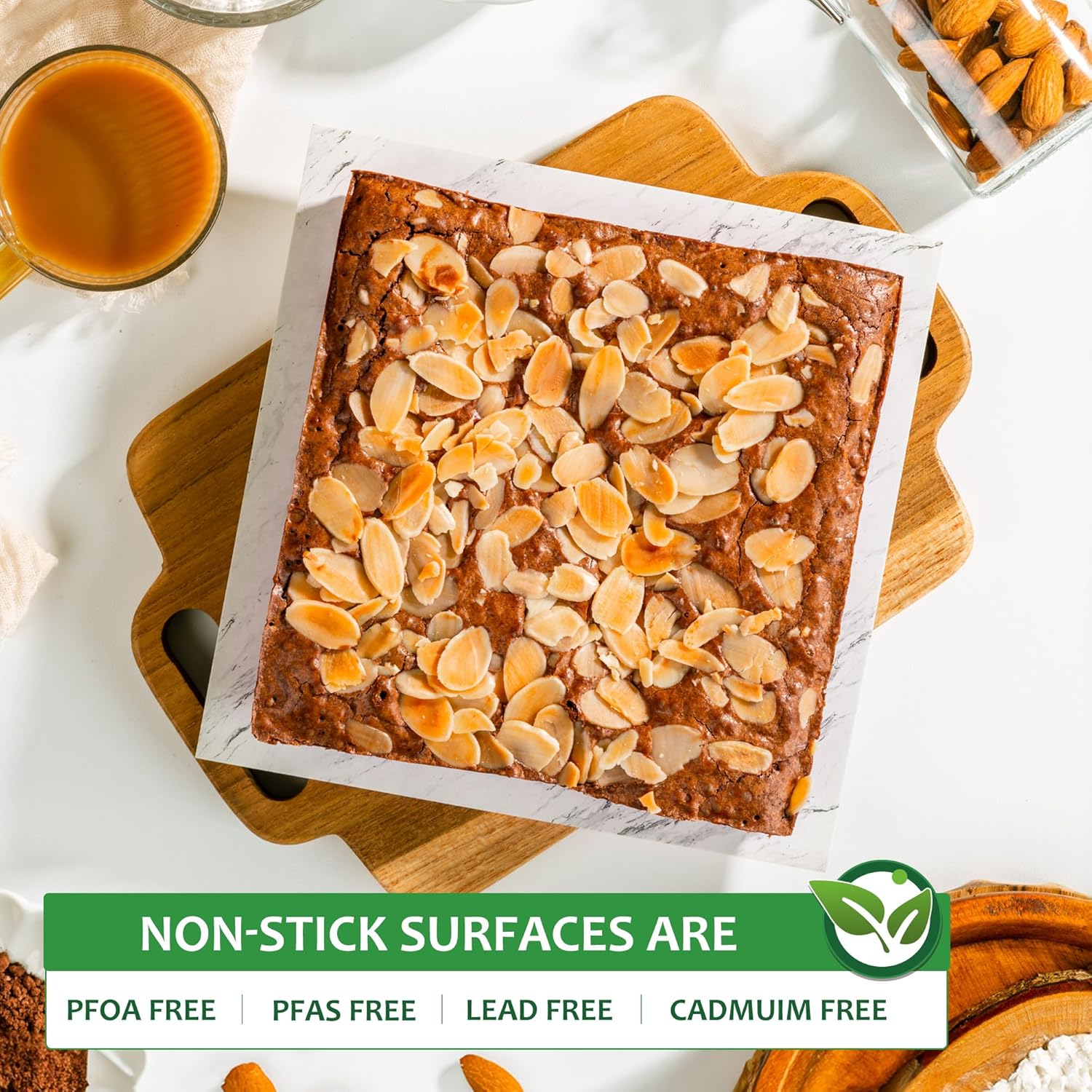 PREMIUM EXTRA-THICK MATERIAL – With 27% thicker carbon steel, this durable 8-inch square baking pan is constructed from heavy-gauge carbon steel for stability, even heat distribution, and durability for years to come. Warranty against peeling off with heat-resistance temperature: 450℉