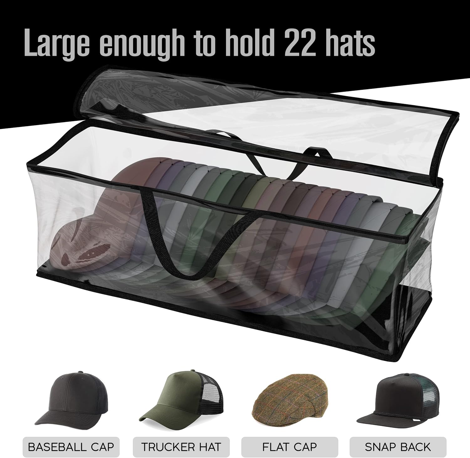 Houseables Baseball Cap Storage Bag, Hat Organizer Case, Cap Holder, Clear Plastic Tote, Black Handles, Moisture & Dust Proof, w/Zipper Closure, Holds up to 22 Hats, Dirt Protection, 23″ x 6″ x 8″