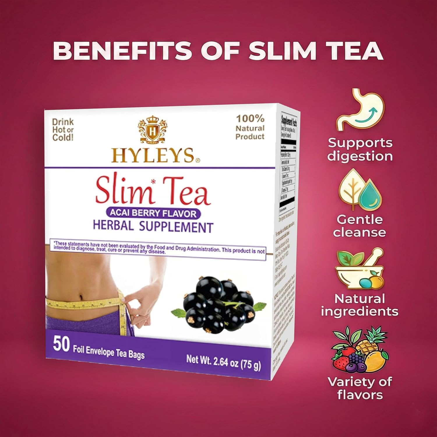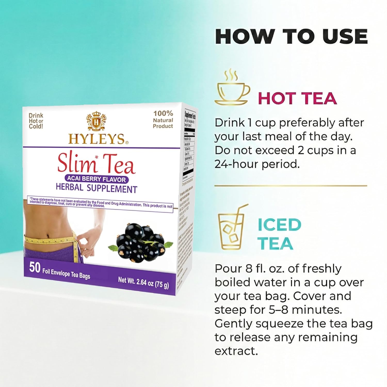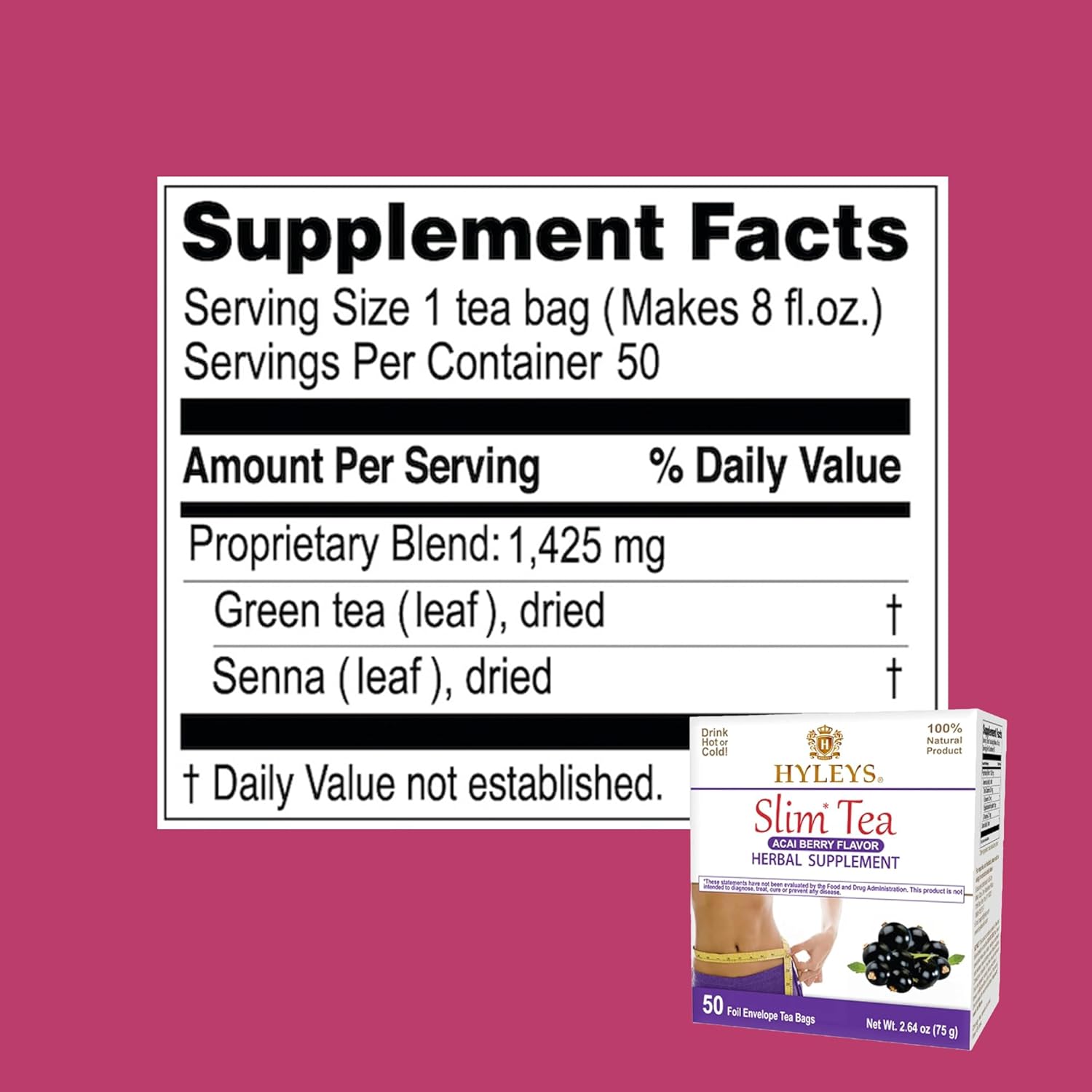 Hyleys Slim Tea Weight Loss Herbal Supplement with Acai Berry – Cleanse and Detox – 50 Tea Bags (1 Pack)