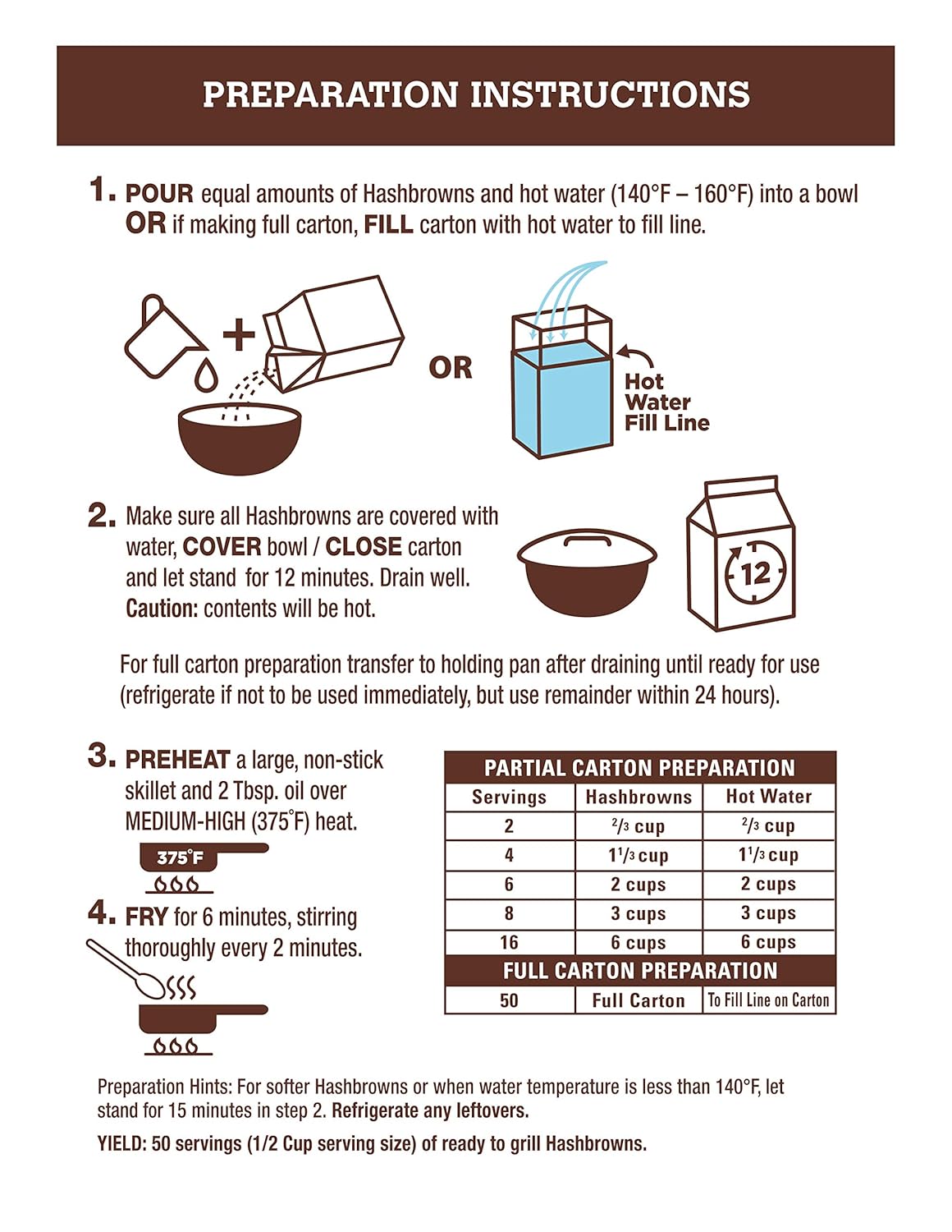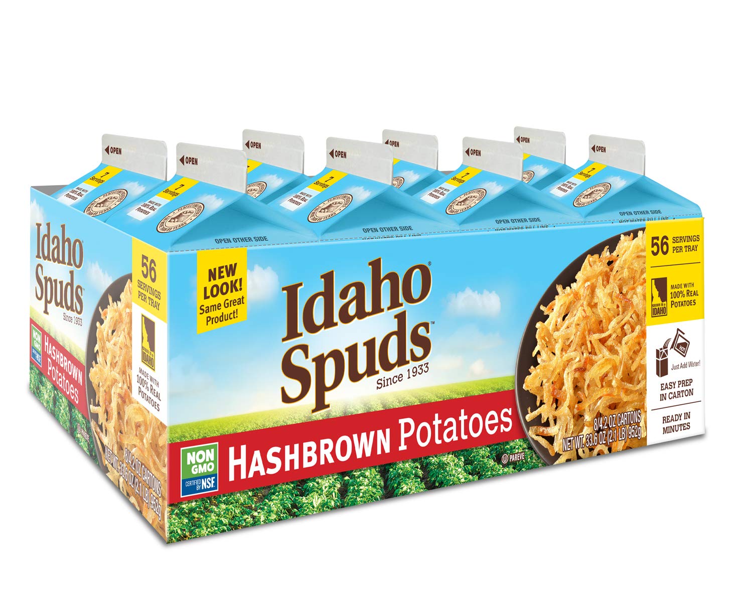 Contains 8 – 4.2oz boxes of Idaho Spuds Premium Hashbrown Potatoes – makes 42 servings across the 6 cartons