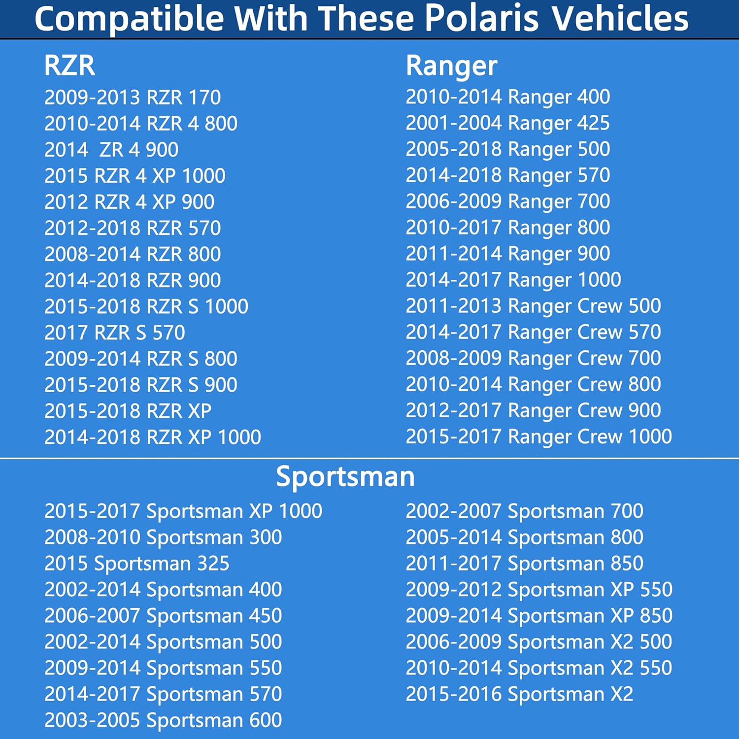 【COMPATIBLE WITH Polaris Ranger】 Compatible With 2010-2014 Ranger 400 | 2001-2004 Ranger 425 | 2005-2018 Ranger 500 | 2014-2018 Ranger 570 | 2006-2009 Ranger 700 | 2010-2017 Ranger 800 | 2011-2014 Ranger 900 | 2014-2017 Ranger 1000 | 2011-2013 Ranger Crew 500 | 2014-2017 Ranger Crew 570 | 2008-2009 Ranger Crew 700 | 2010-2014 Ranger Crew 800 | 12-17 Crew 900 | 15-17 Crew 1000 | 16-18 Crew XP | 10-18 Ranger EV | 09-2010 HD | 17-18 XP 1000 | 16 XP 570 | 05-09 XP 700 | 10-14 XP 800 | 12-16 XP 900