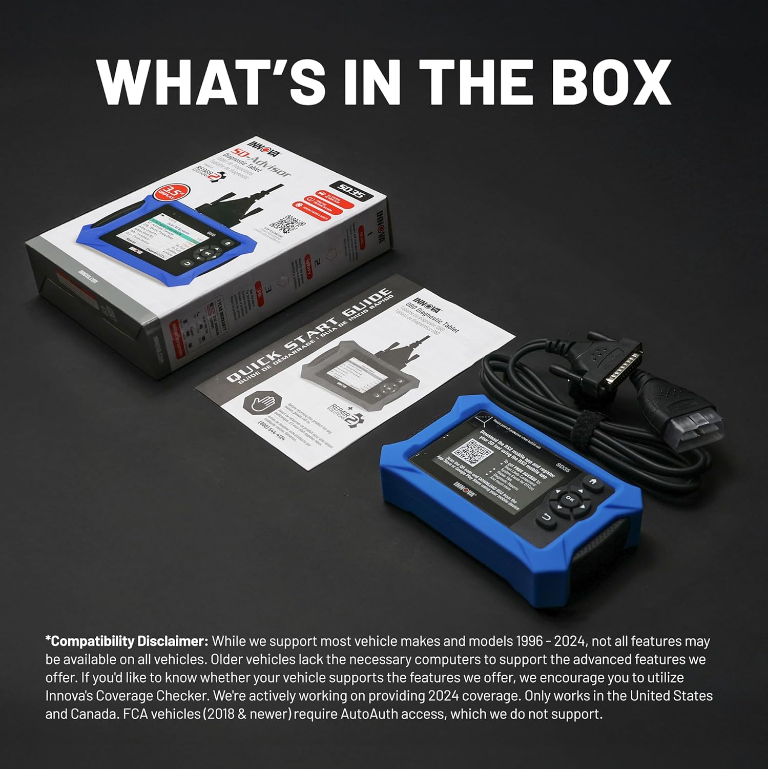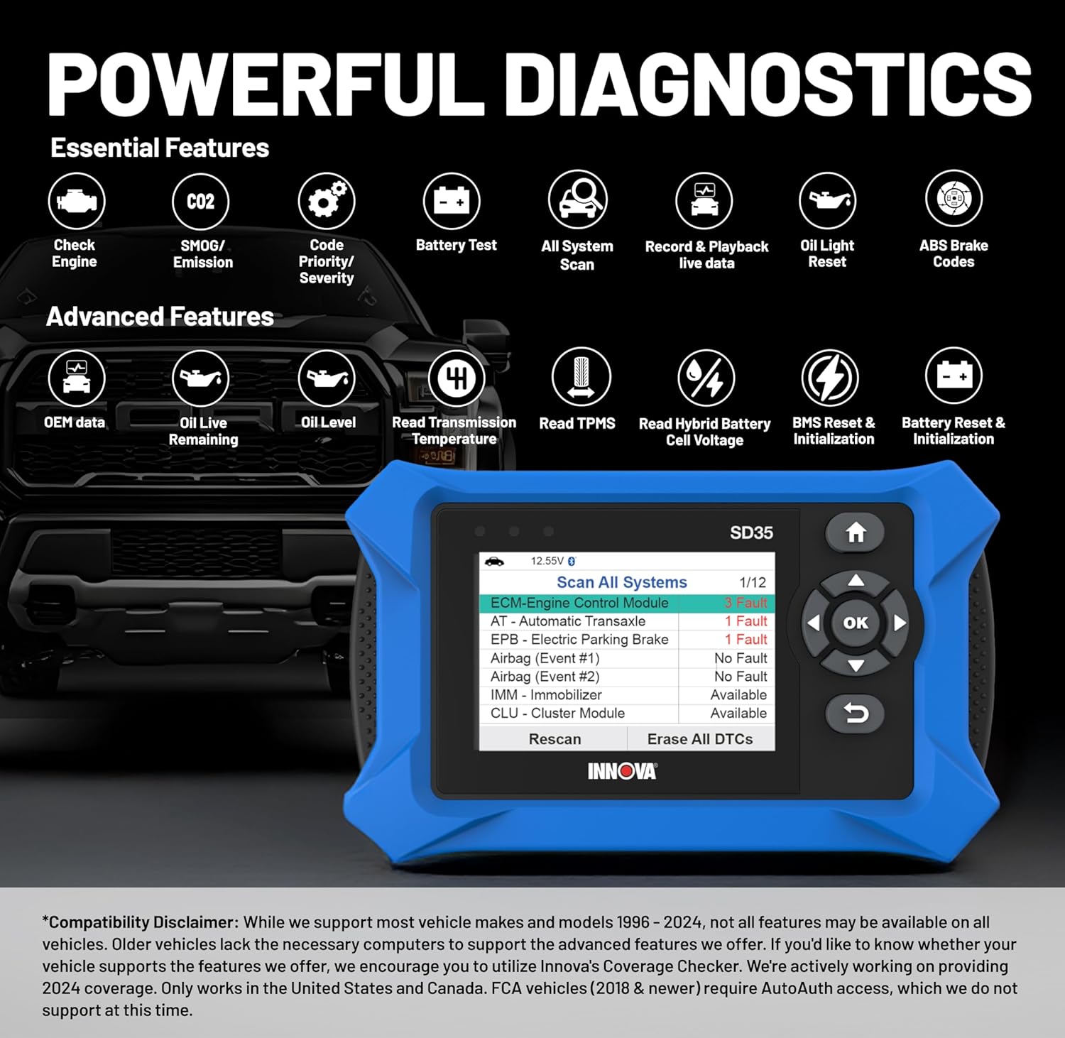 OBD2 SCANNER FOR ALL SYSTEMS – The INNOVA SD35 is a tablet-based OBD2 scanner designed for advanced diagnostics. Read and clear check engine light, ABS, SRS, and TPMS codes, plus test your car battery and alternator to prevent unexpected failures. Vehicle coverage may vary. Please use Innova’s Coverage Checker to verify compatibility.