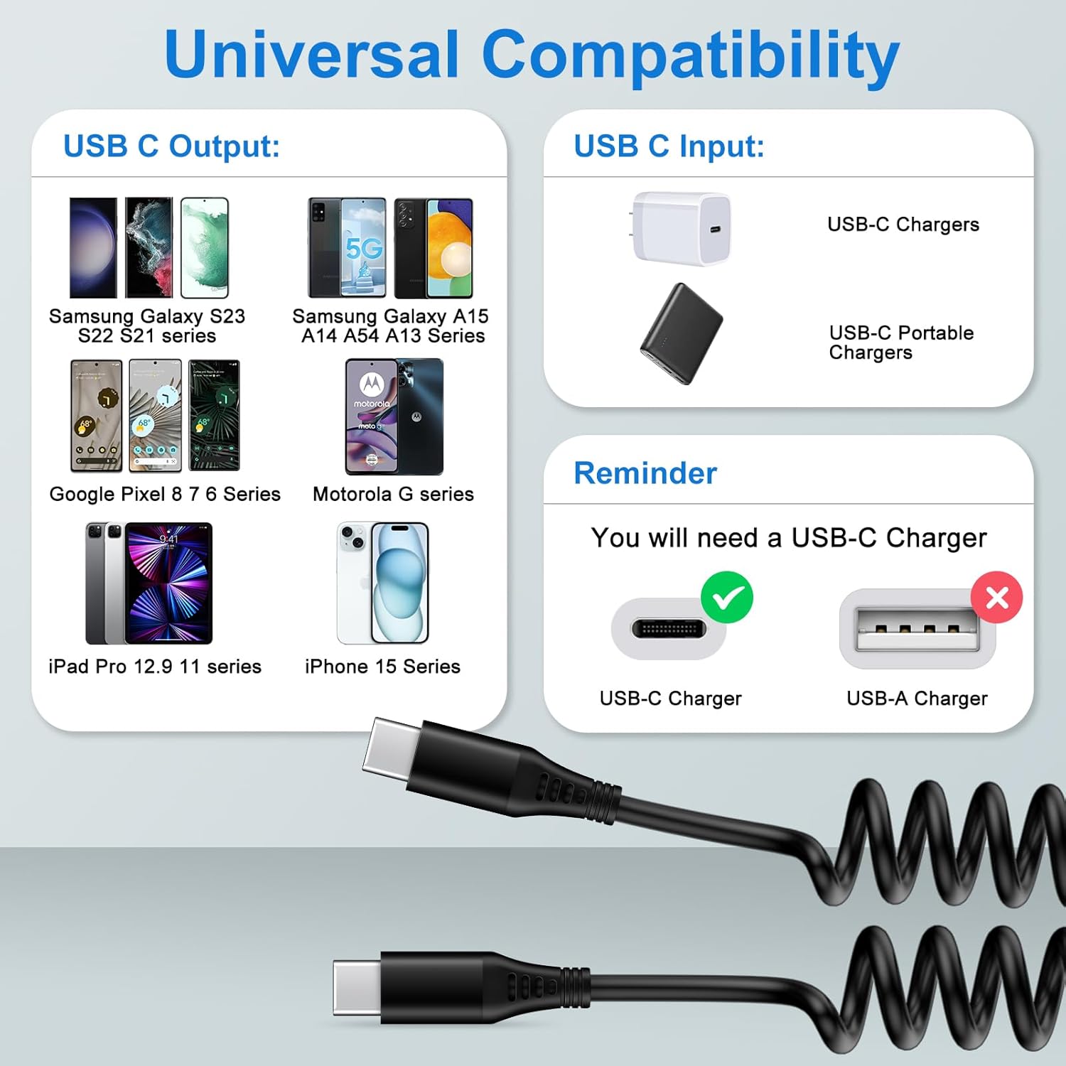 iPhone 17 Air 16e 16 15 Pro Max Charger Cable 3FT for Car, Coiled USB C to USB C Fast Power Charging Cord Short Android Phone Wire for Samsung Galaxy A15 A25 5G A14 A54 S24 S23 Ultra FE A13 A53