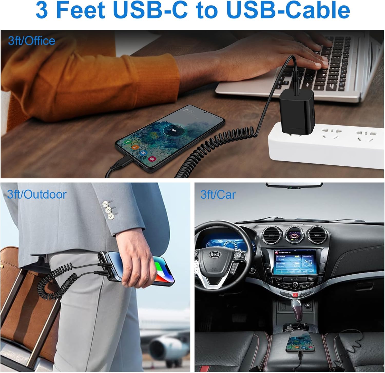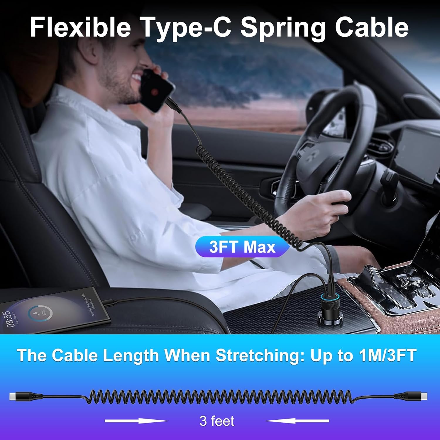 【Retractable iPhone 15 Cable for Car】: 3 feet coiled iPhone 15 car charger with spring shape design usb c to c cable is with short cable functions. 0.35 Feet before stretching, maximum stretch length is 3 Feet. If you use the samsung s23 charger cable in the front seat of car and store your device in a compartment, 3 feet is the best choice.