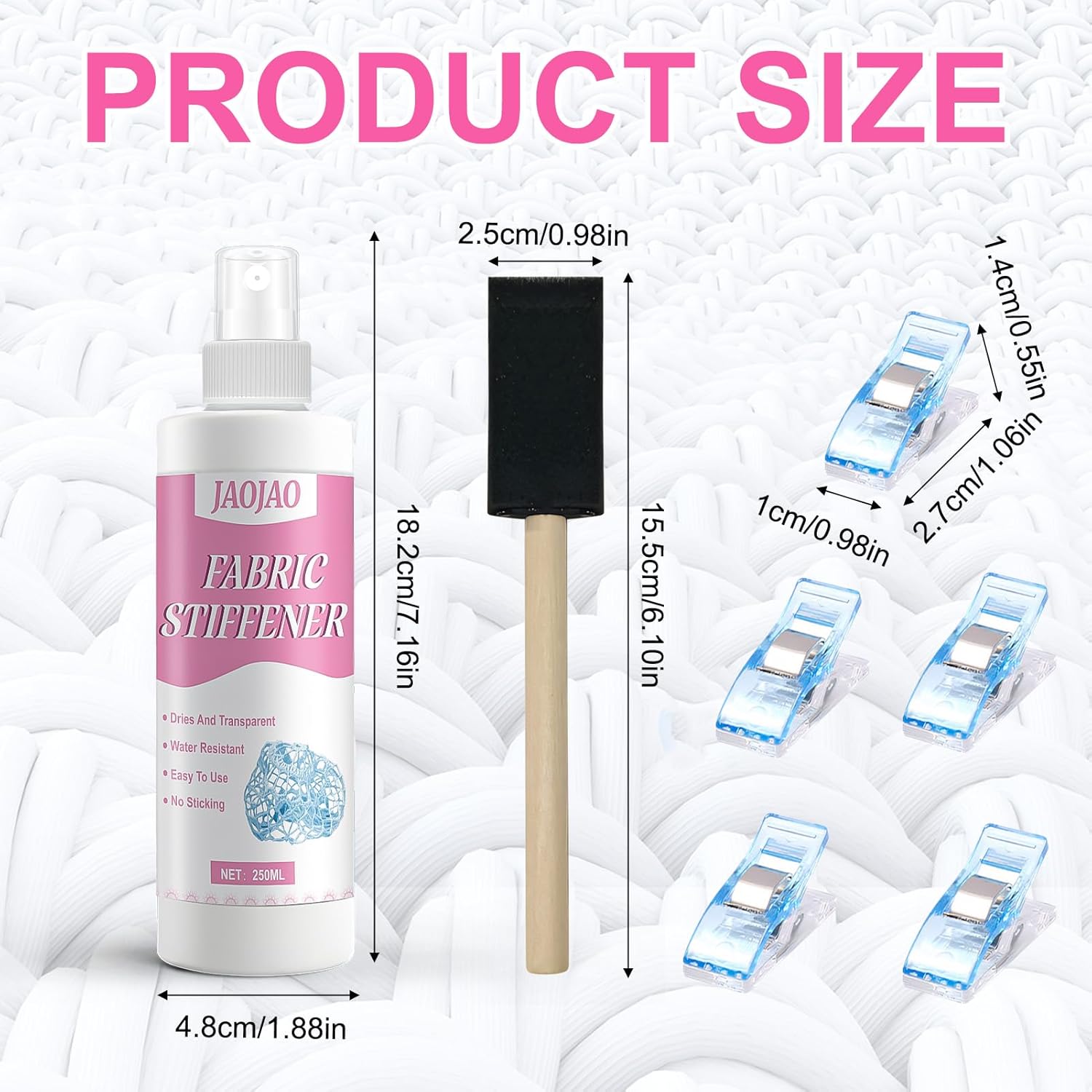 JAOJAO Stiffen Quick Fabric Spray, Fabric Stiffener Spray for Clothing Hat Shaping, Collapse Prevention, Quick Drying, with 5 Small Clothes Pin, Sponge Brush, Suit for Cotton,Canvas, Ribbon, 8.4 oz