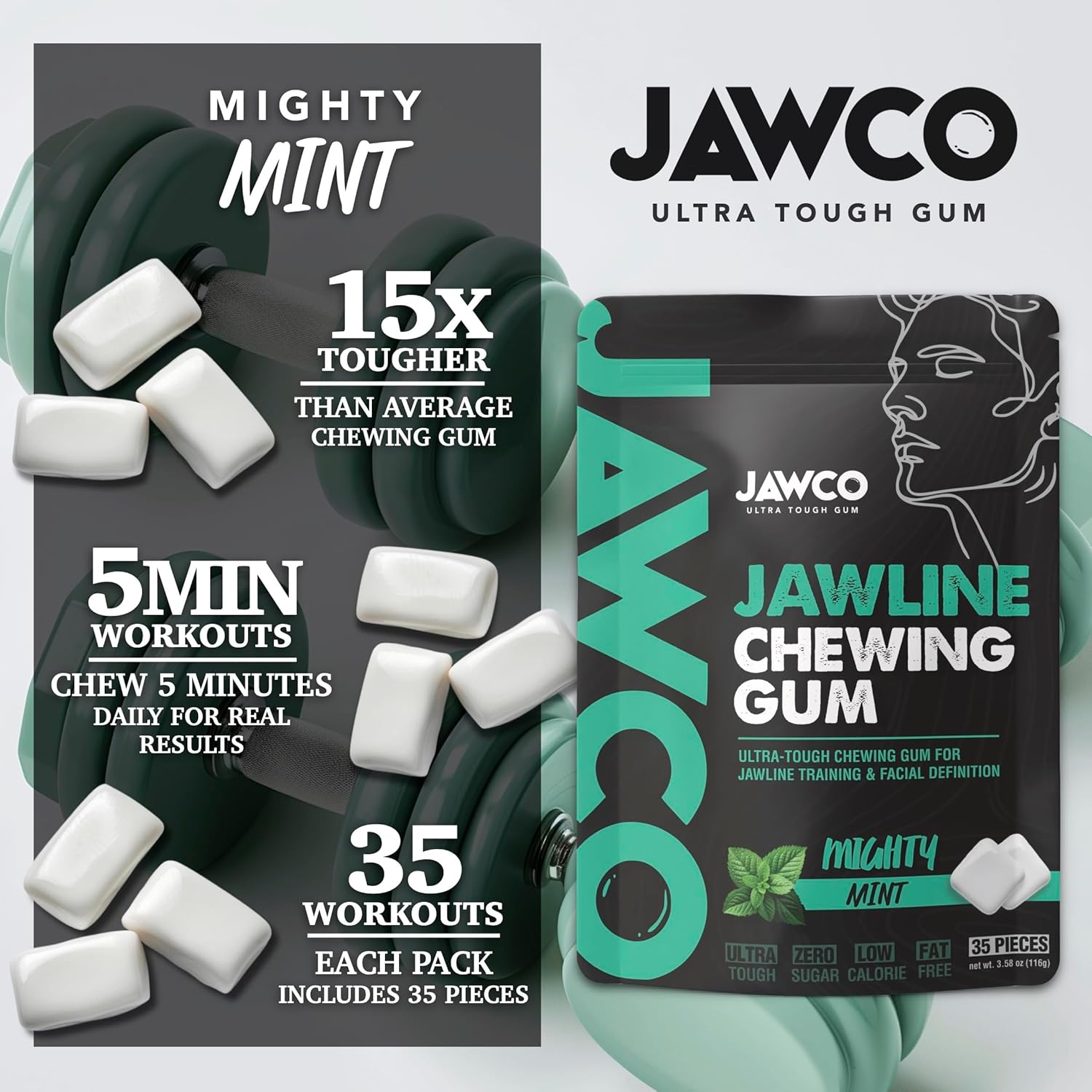 JAWCO Ultra-tough Jawline Chewing Gum | Get a Stronger, Squarer Jawline | Mighty Mint Jaw Training Hard Gum | Chisel, Sculpt, Tone your Jaw | 15X Hardness | Facial Fitness Mewing Gum | 35 Pieces/Pack