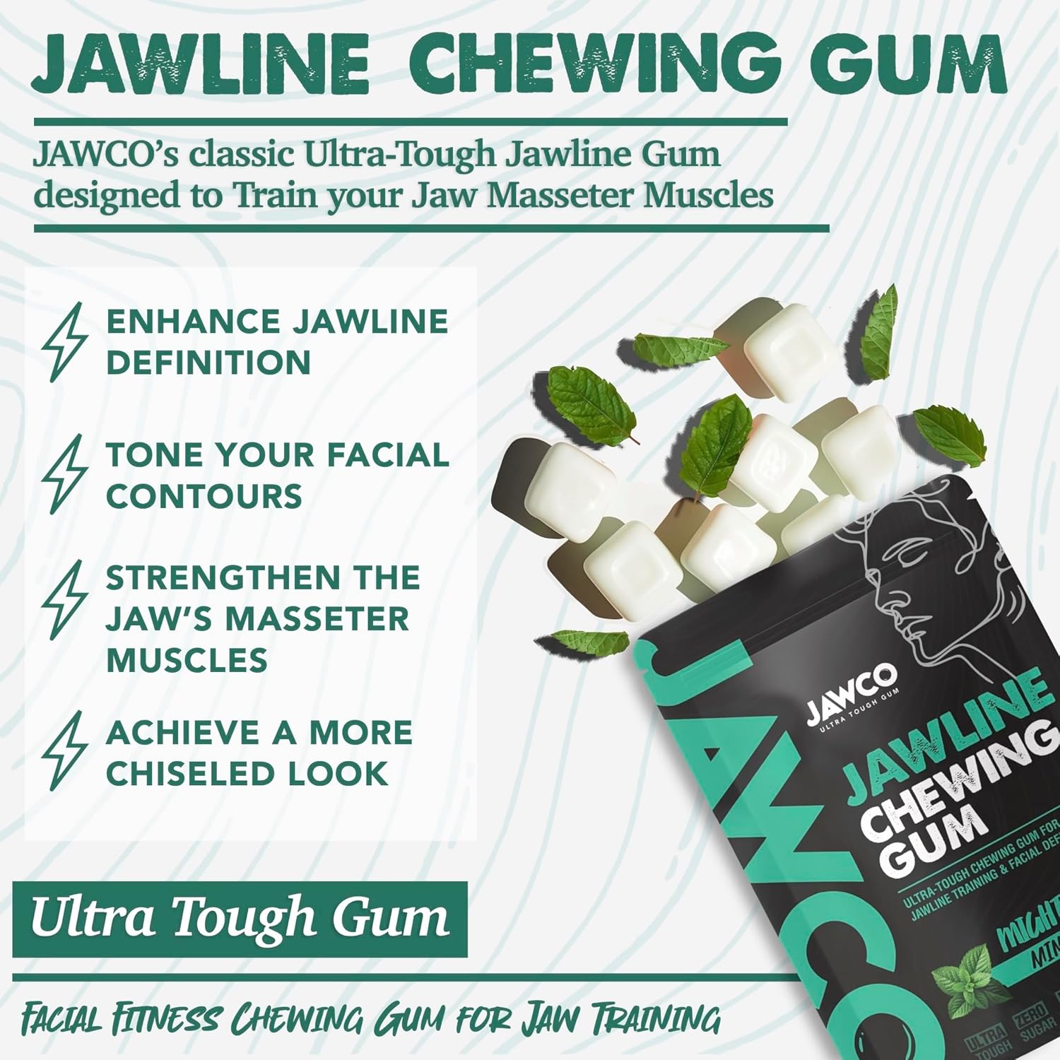 ENHANCE YOUR JAWLINE & FACIAL CONTOUR — TRAIN, STRENGTHEN, DEFINE. – JAWCO’s ultra-tough gum activates and strengthens the jaw muscles that define the shape and contour of your face. Regular use helps enhance jawline visibility and create a sharper, more structured appearance — delivering that strong, confident look that turns heads.