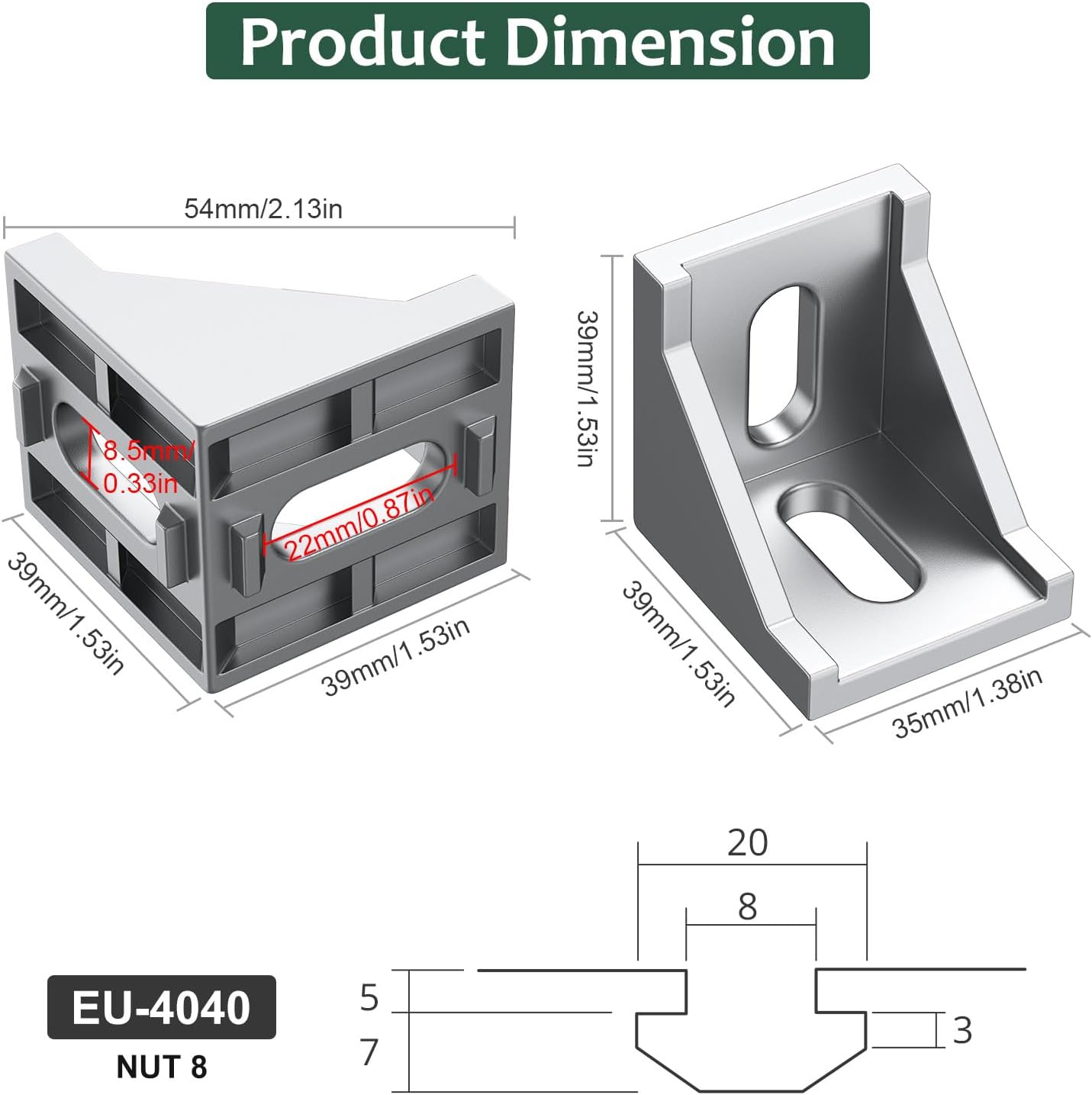 【Size】With a size of 39x39x35mm (1.5×1.5×1.4 inches), this aluminum profile corner bracket is suitable for most 40×40 and 40×80 profiles, allowing for seamless integration with various aluminum extrusions at a 90-degree angle