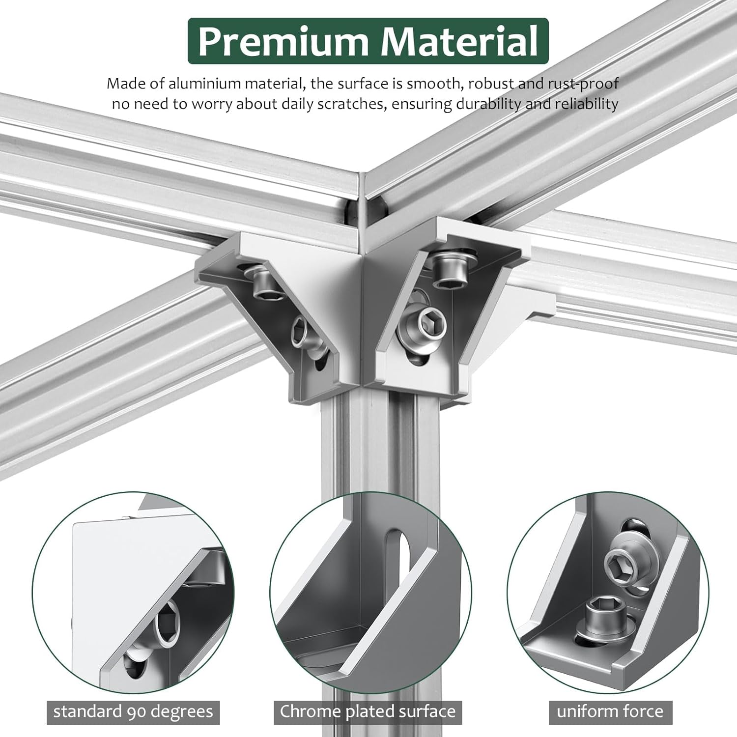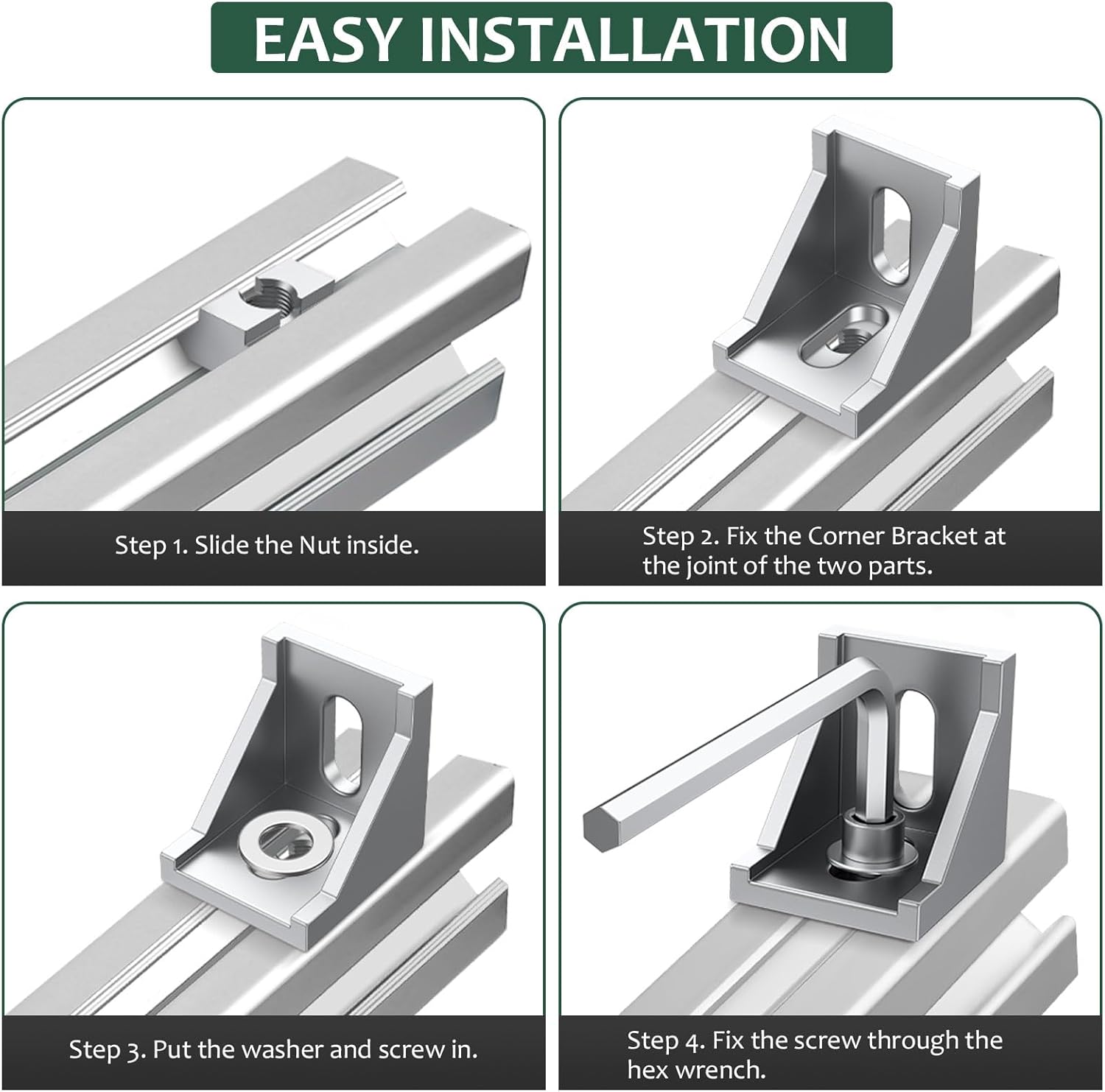 【Package Content】10pcs 4040 4080 series aluminum extrusion connectors, 20pcs screw set, 20pcs T-sliding nuts, 1pc hex wrench, it’s incredibly easy to assemble and use