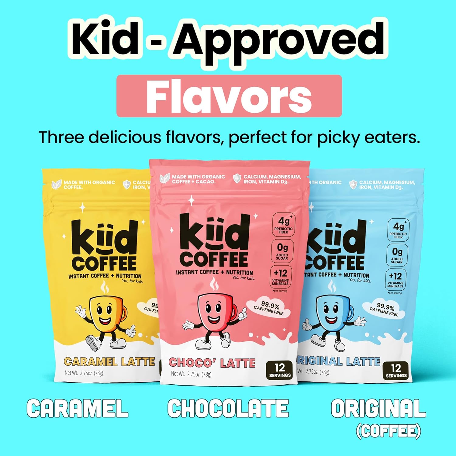 Founded by a 7-year-old, Formulated by Dad (and backed by science) – It’s true, Kiid Coffee was thought up by a 7-year-old after two leg breaks led this family to a scary realization. Kids aren’t getting enough essential nutrients, while food and supplement companies make bold, misleading claims about the nutrition in their products. Kiid Coffee became this family’s solution to picky eating, and the lack of true nutrition in most foods, which can quickly lead to common dietary deficiencies. Scientific research confirms the low intake of calcium, iron and dietary fiber effect long-term health.