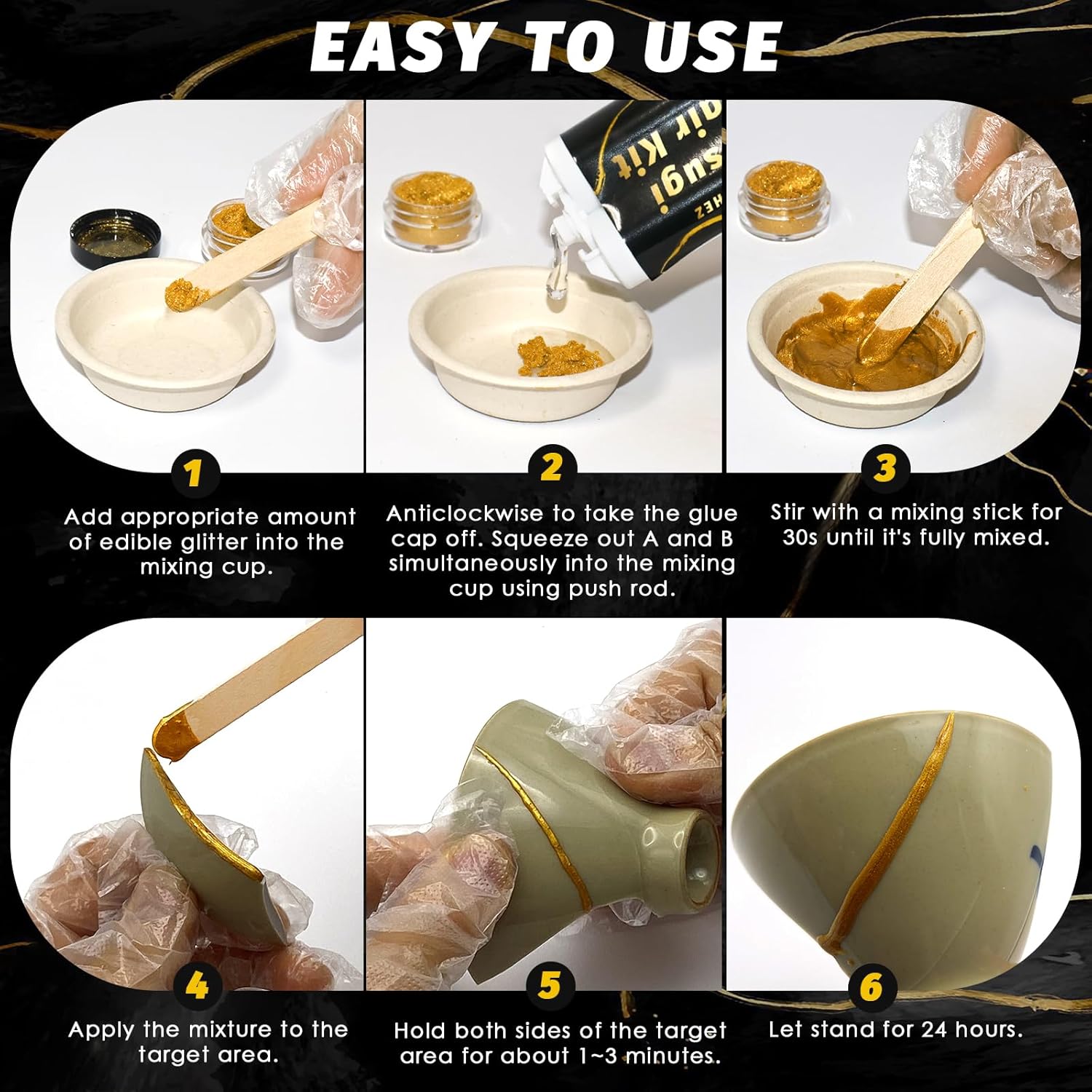 EASY TO USE: First add edible gold or silver powder to the measuring cup. Squeeze kintsugi glue A and B into it with the push rod, stir for 30 seconds. Apply the mixture to the damaged area, press for 1 – 3 minutes, and let it sit for 24 hours. After use, wipe the gold glue outlet clean and close the lid to prevent sticking and ensure it can be opened easily next time.