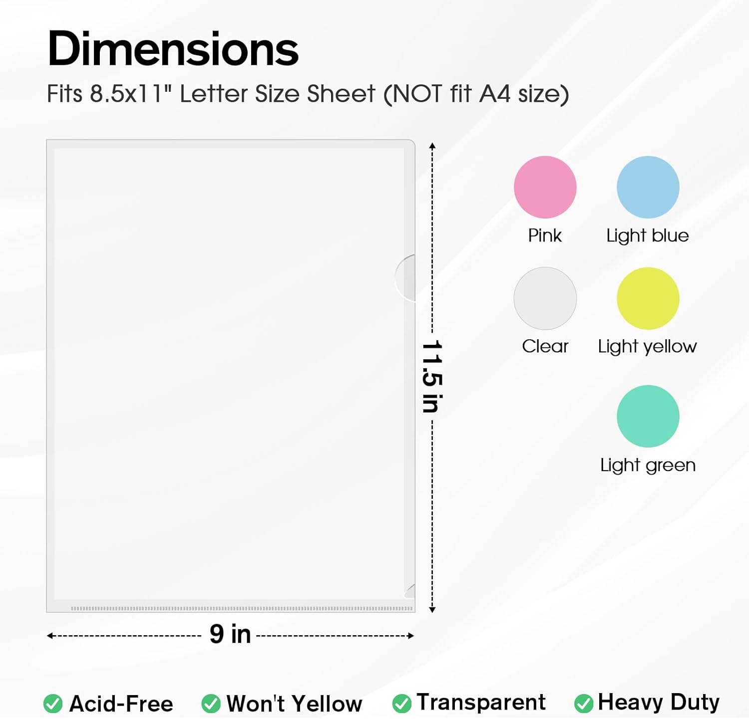 Standard Plastic File Folder: Each plastic project sleeve is 11.42″(L) x 8.9″(W), and fits standard 8.5″ x 11″ paper, letter size (Not A4). Plastic sleeves for paper 8.5×11