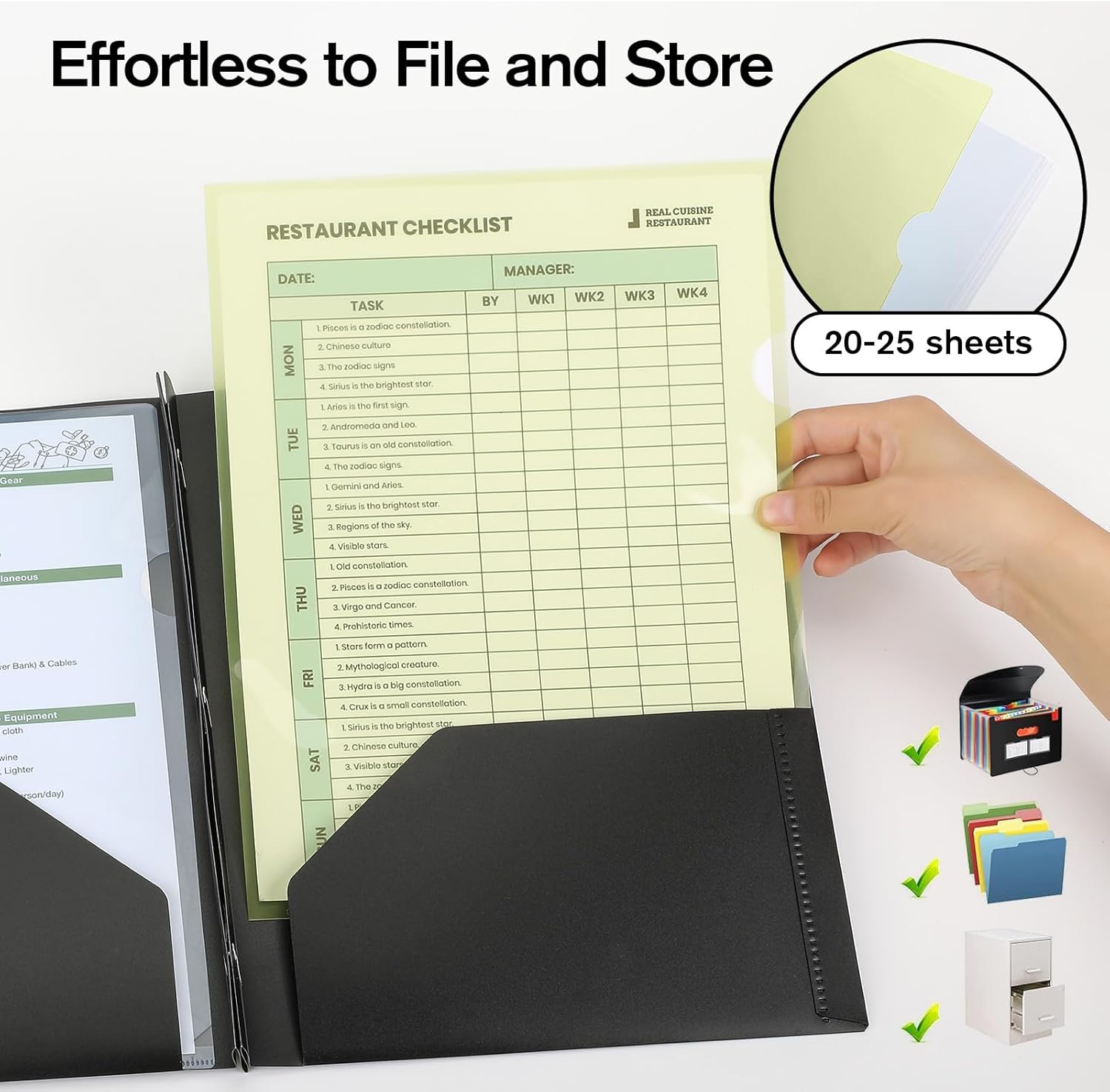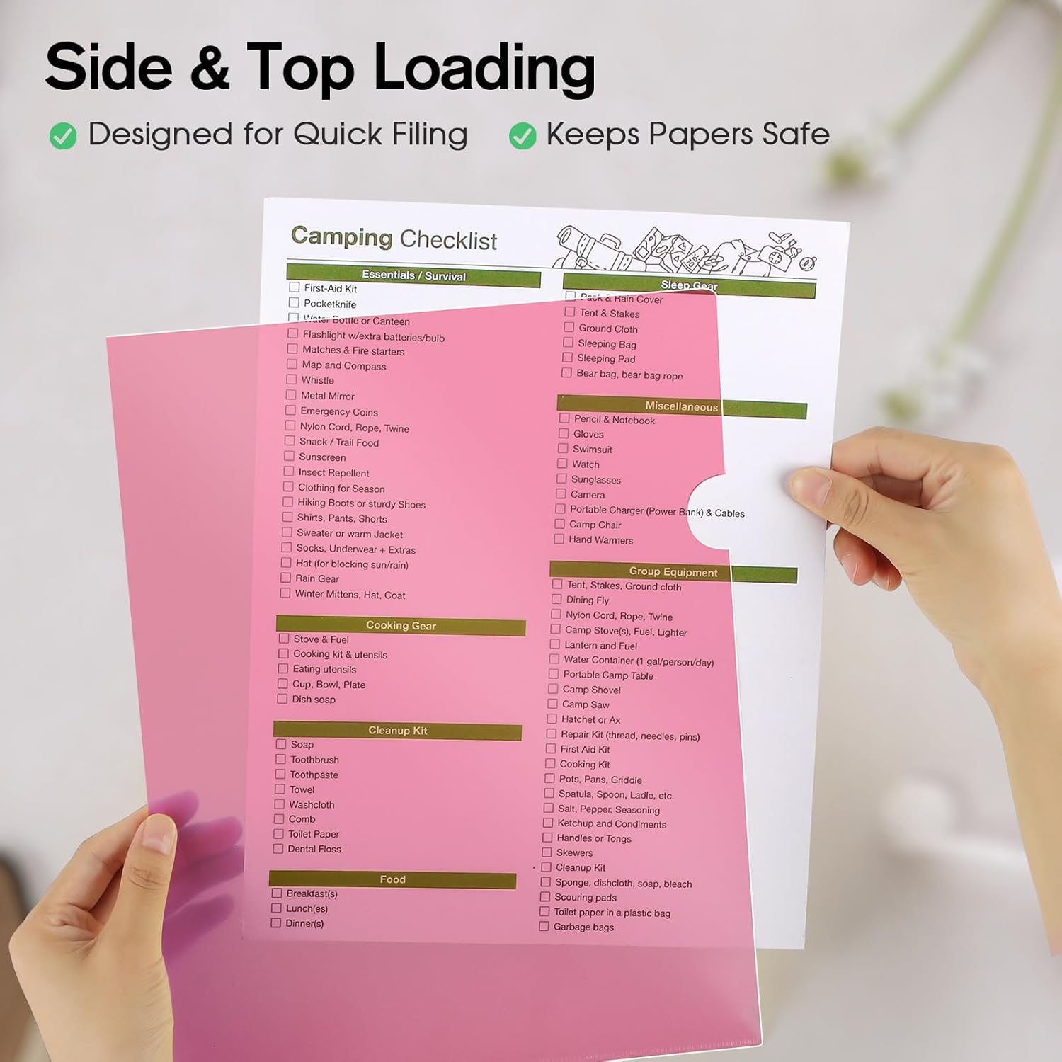Convenient L-Type Design: Top and side-loading, thumb notch for easy access. Perfect for storing loose pages, important files, receipts, coupons, and more