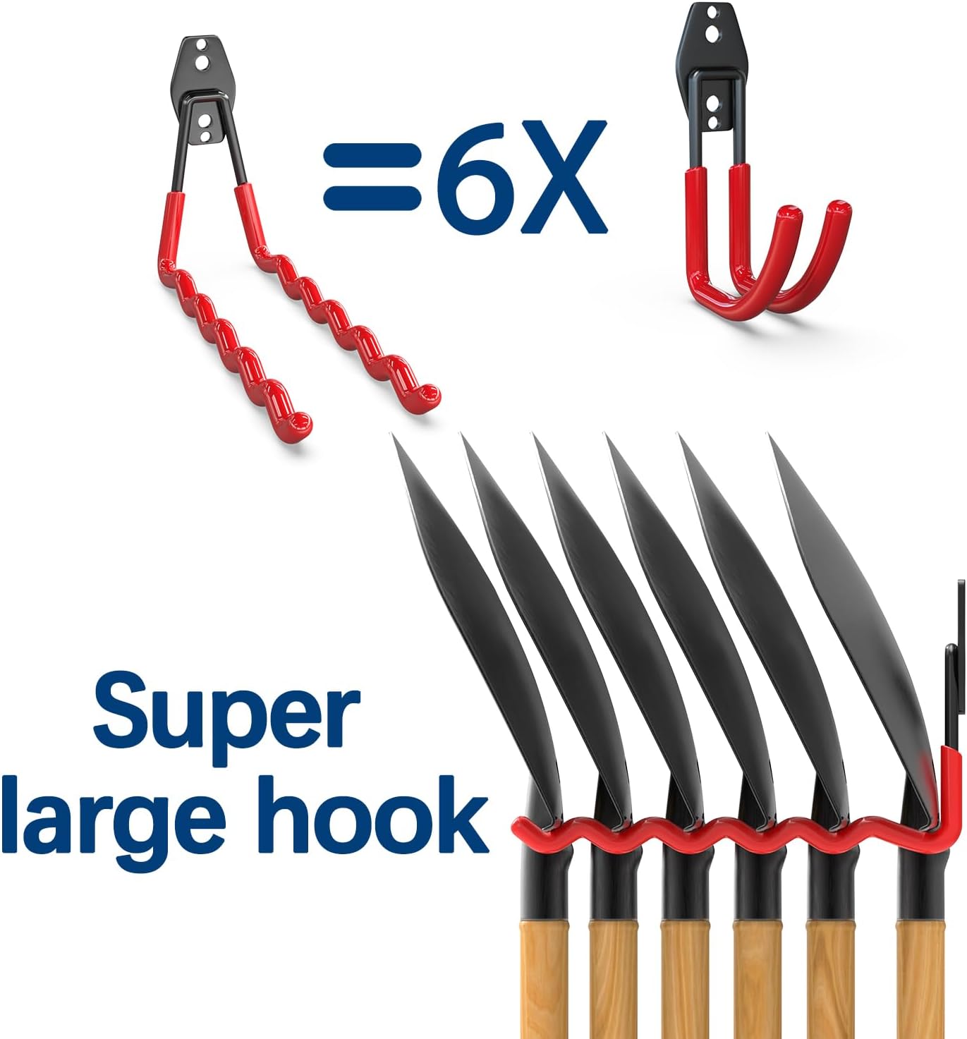 The 2 large wave shape garage hooks each can hold 6 garden tools