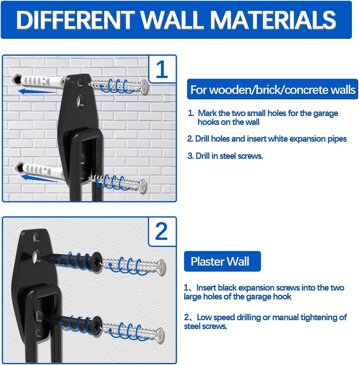 EASY TO INSTALL: The garage hook is equipped with 2 types of screws, which can be applied to concrete walls, wooden walls and brick walls.Two kinds of screws for different walls, white wide screws for wide threaded screws for plaster walls, expansion anchors for expansion anchors for brick walls, wooden walls and concrete walls, all need to use the provided metal screws. with the wall hooks your garage,garden,shed,basement will look clean and grab whatever your need in minute.