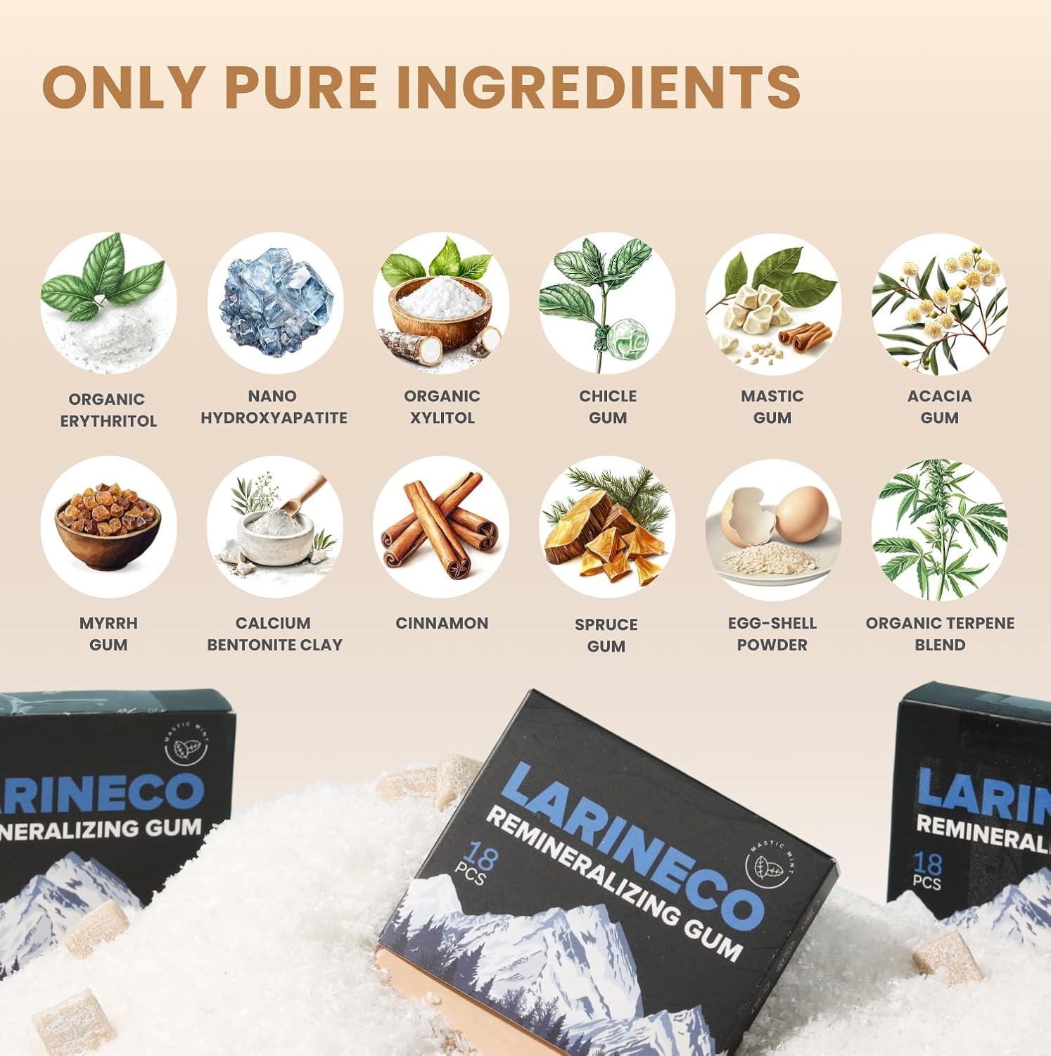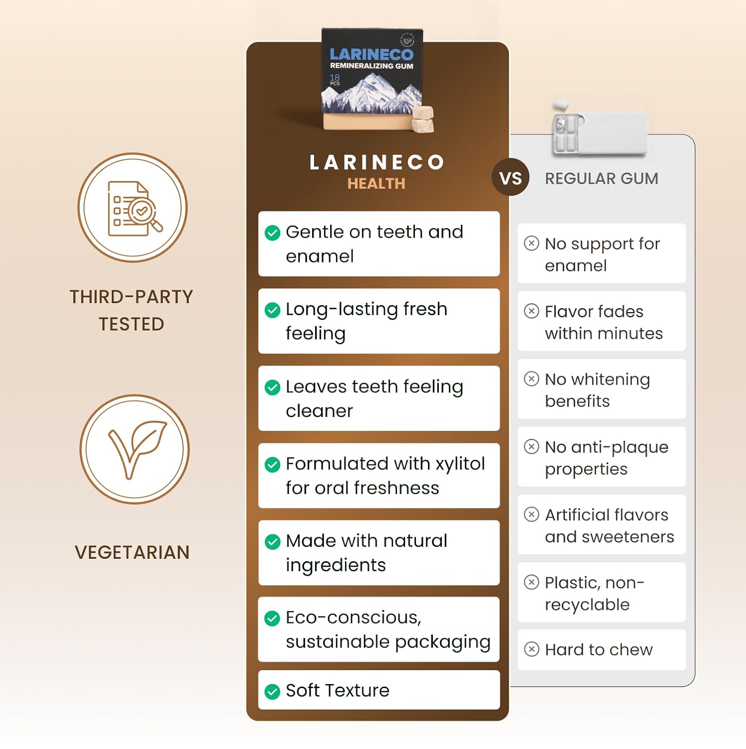 No Aspartame, No Dyes, No Plastic Gum Base: Larineco gum is made without artificial dyes, synthetic sweeteners, or plastic gum bases. It uses a chicle-based natural gum formula and botanical flavor oils.