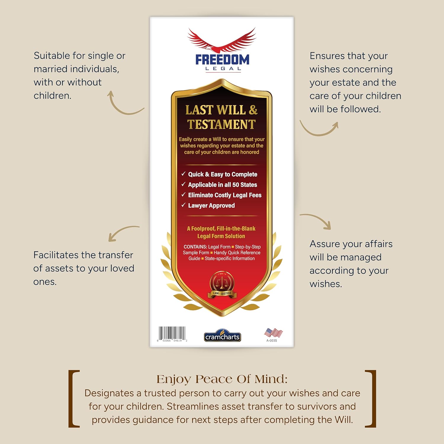 Distribute assets as you wish. Appoint a guardian for minor children. Appoint a trusted executor to carry out your will. Simplify probate and avoid family disputes. Speed up asset transfers to loved ones. Fast, easy & virtually foolproof. Printed on 100% acid-free, archival-grade paper for lasting preservation.