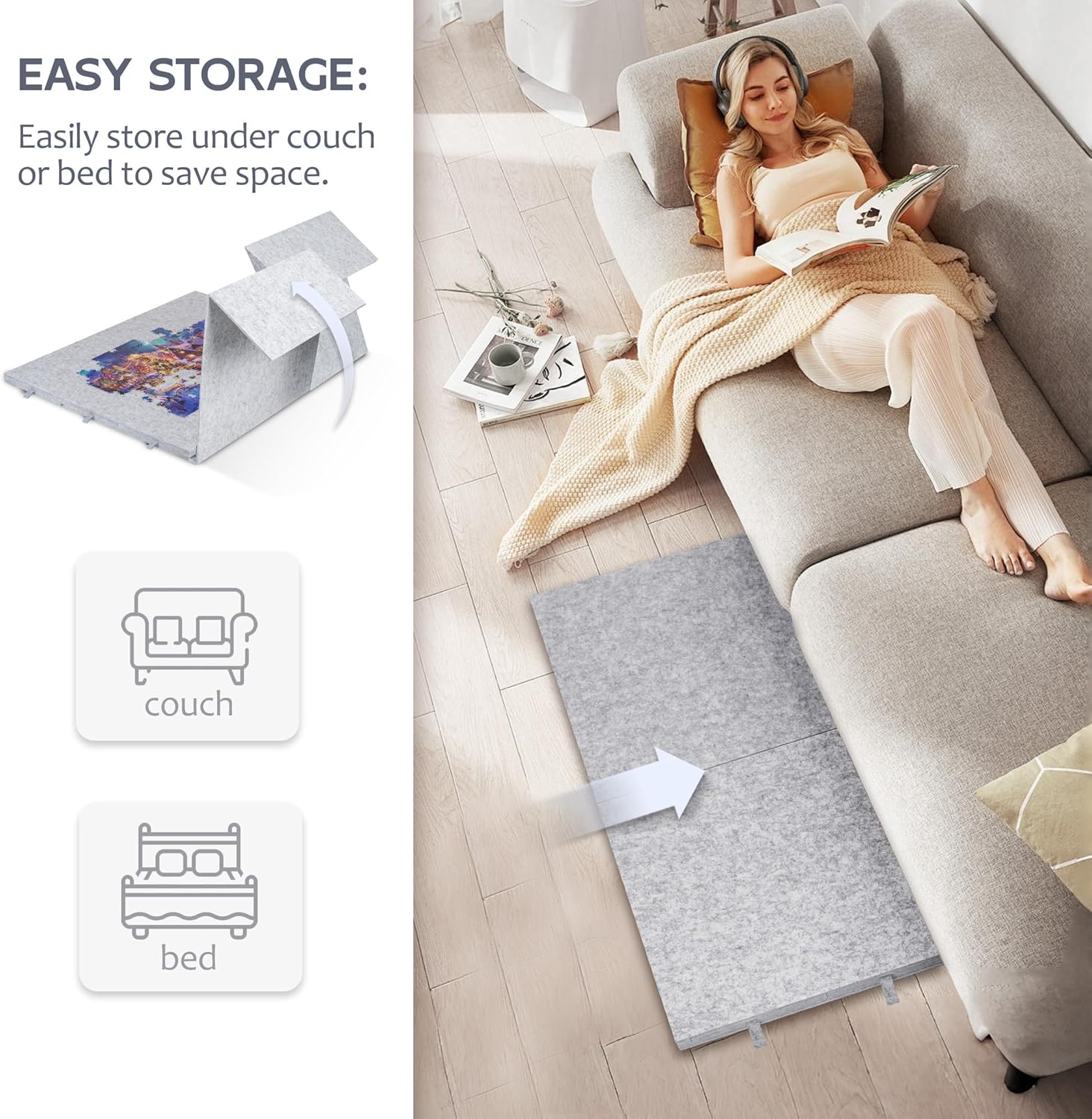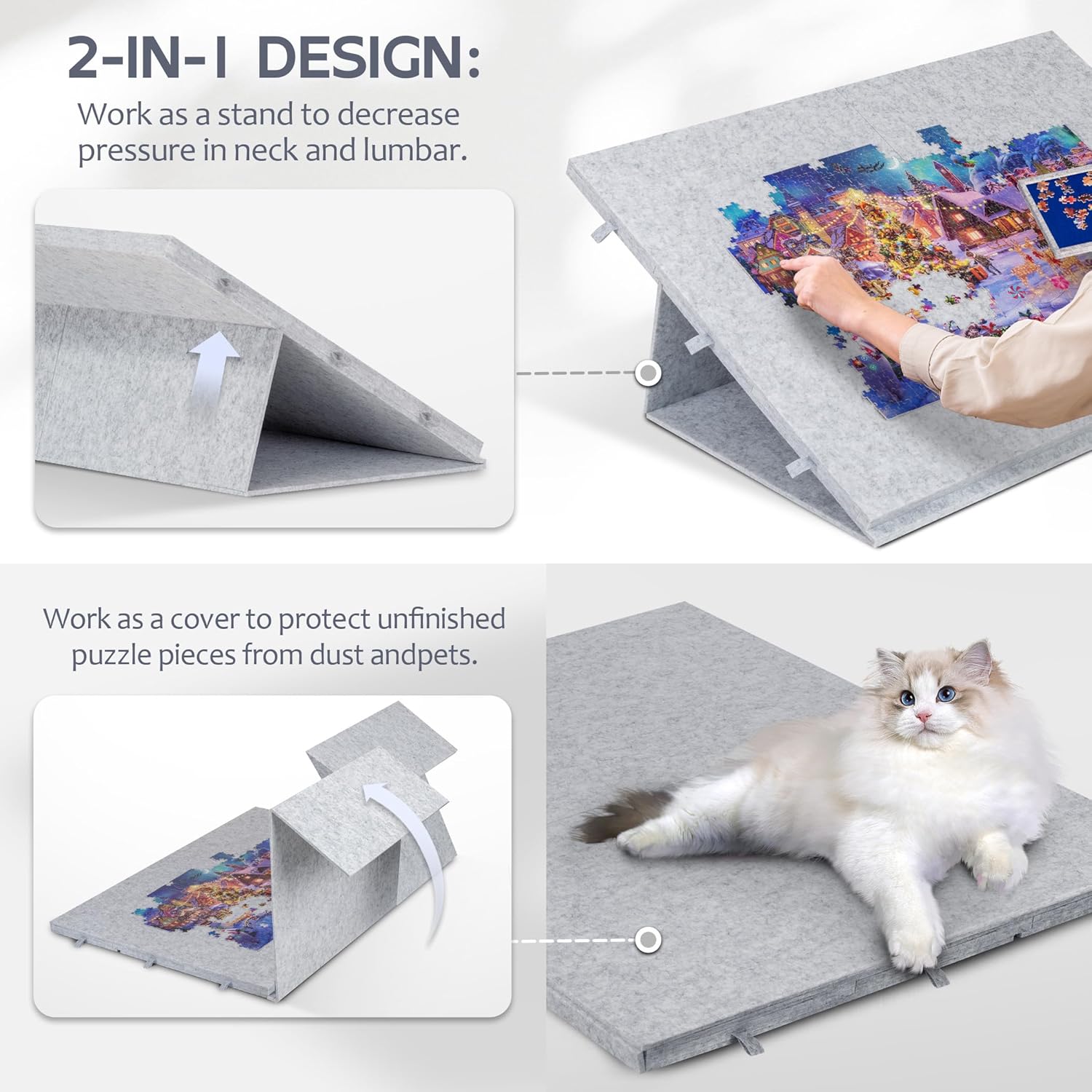 2-In-1 Jigsaw Puzzle Stand & Cover – A combination of puzzle stand/easel and jigsaw puzzle board cover. When working as a puzzle stand, it helps to set up the puzzle board at a best angle to reduce stress accumulated in the neck and back during puzzling. When working as a board cover, it protects your unfinished puzzle game by avoiding missing pieces and prevents pets from messing with them.
