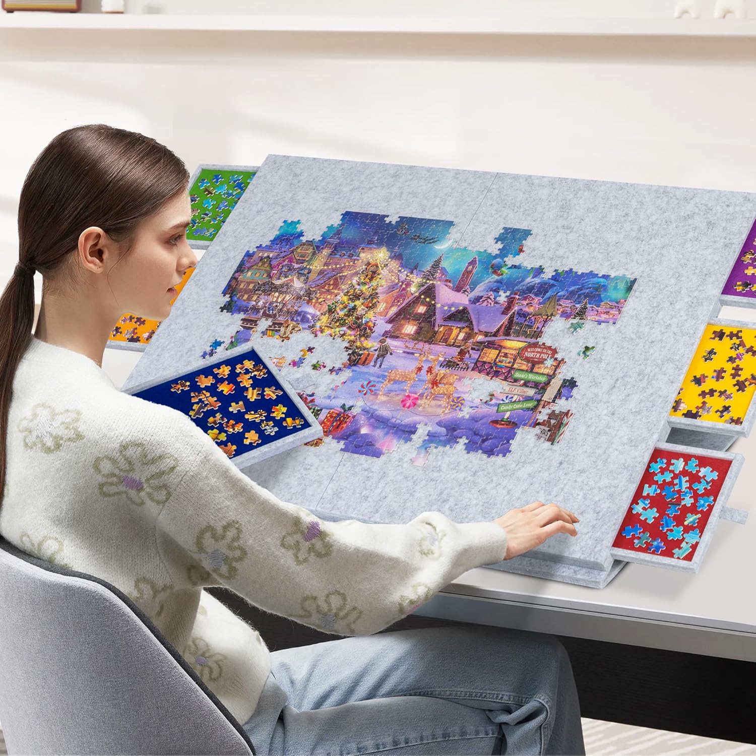 Jigsaw Puzzle Board with 6 Drawers – The jigsaw puzzle board is designed with 6 drawers lined in different colors to make it easy to sort and store puzzle pieces by the color, shape or pattern to ensure a higher game efficiency. Each drawer includes a drawstring for easy pulling out. The material of the drawers ensures enough friction so keep them closed during transport and avoid missing pieces.