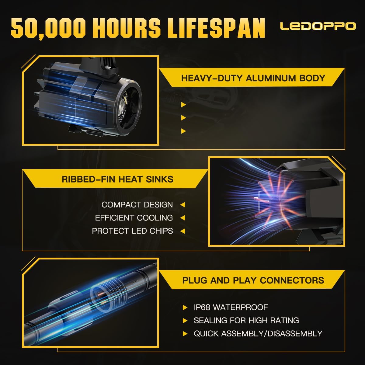 【Over 50,000-Hour Lifespan】LEDOPPO Motorcycle Fog Lights Body Are Buid By Heavy-Duty Die-Cast Aluminum with Ribbed-Fin Heat Sinks for Efficient Heat Dissipation,Ensuring Long-Term Performance Without Light Decay or Burnout.Full Weather-Proof Sealed Led Motorcycle Driving Fog Lights with IP68 Waterproof Glue & Ring,Even the Power Input Hole is Protected by a Soft Rubber Plug,Ensure Sealing For High Rating,Making LED Motorcycle Auxiliary Lights Cope to Rain,Snow,Fog,Daily Wash.