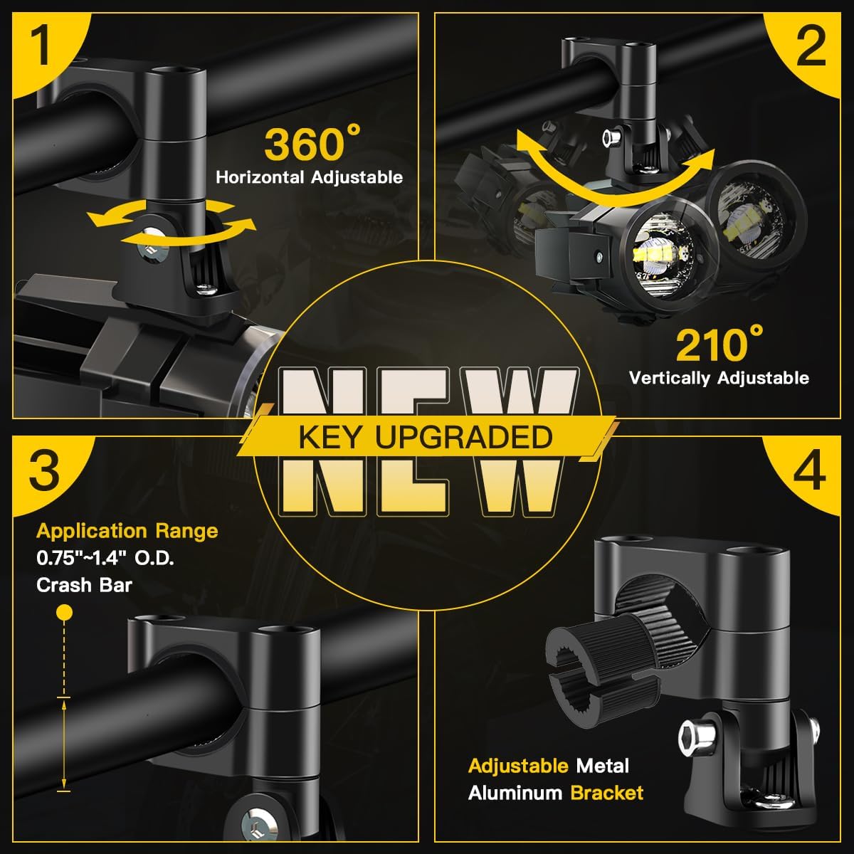 【Mounting Brackets Upgraded】Compared With The Plastic Brackets on the Market,LEDOPPO Motorcycle Fog Lights Upgraded The Material of Clamp Brackets to Metal Aluminum with Adjustable,210° Vertically & 360° Horizontally Rotated;The Fitment Range is Increased From 0.75″ to 1.4″ O.D. Crash Bar,Offering Ultimate Flexibility in Mounting and Aiming.Simplifying Mounting.