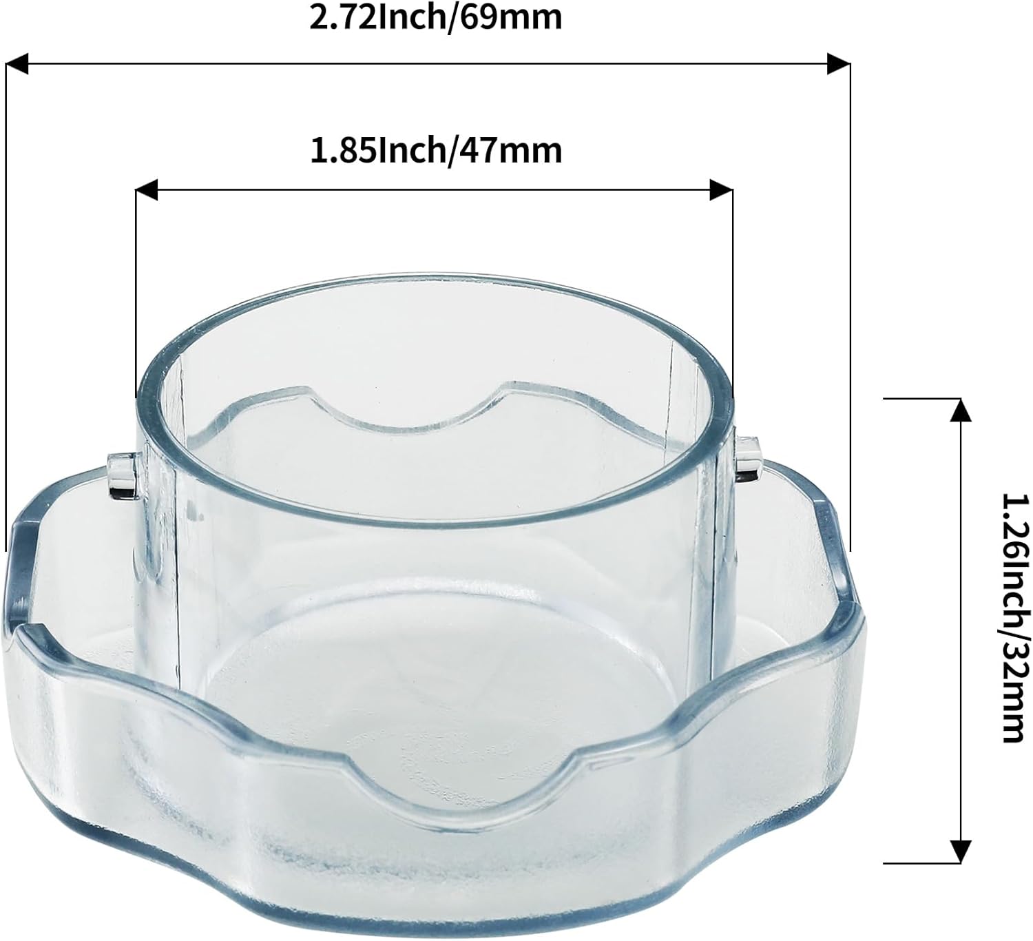 DIMENSIONS – The Replacement Lid Plug has an outer cup diameter of 2.72 inches (69mm), an inner cup diameter of 1.85 inches (47mm), and a height of 1.26 inches (32mm), as shown in the product images.