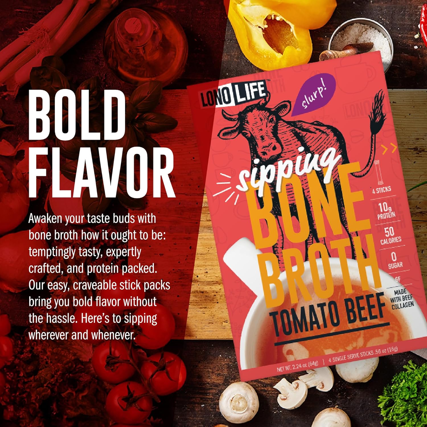 LonoLife bone broth is quite simply bone broth in a dehydrated form. Just add to hot water! Available in single serve packets, bring with you to work or play for a healthy, delicious snack.