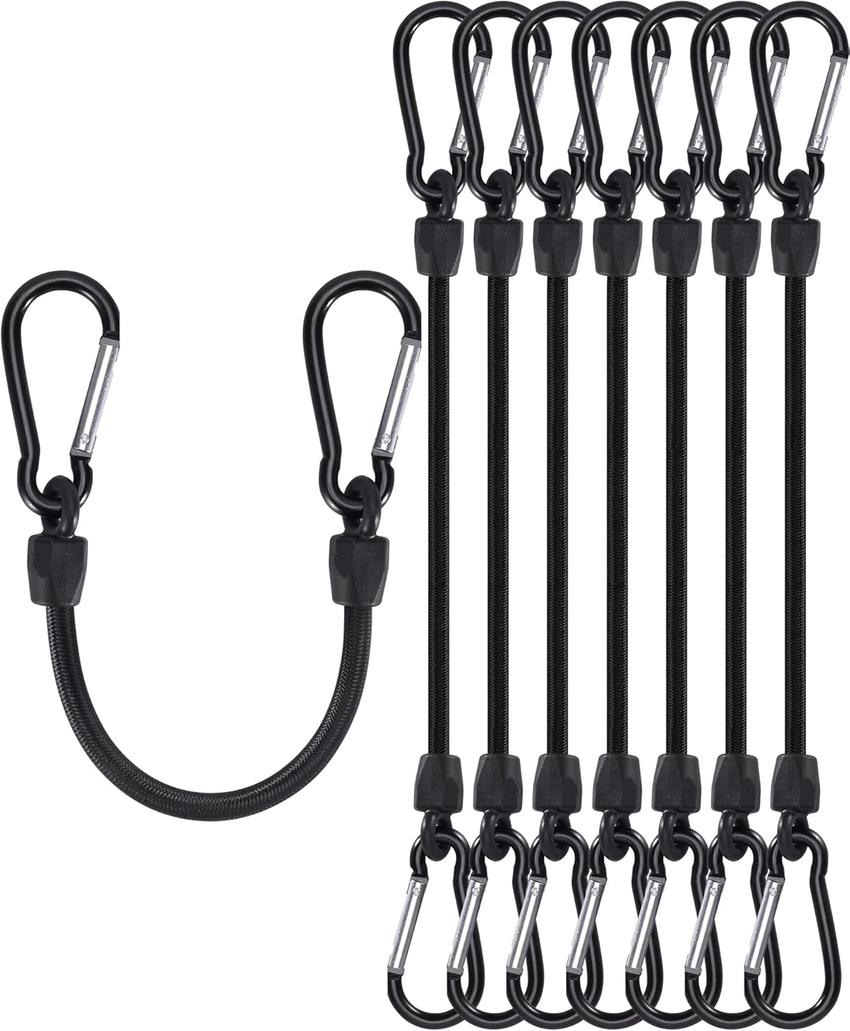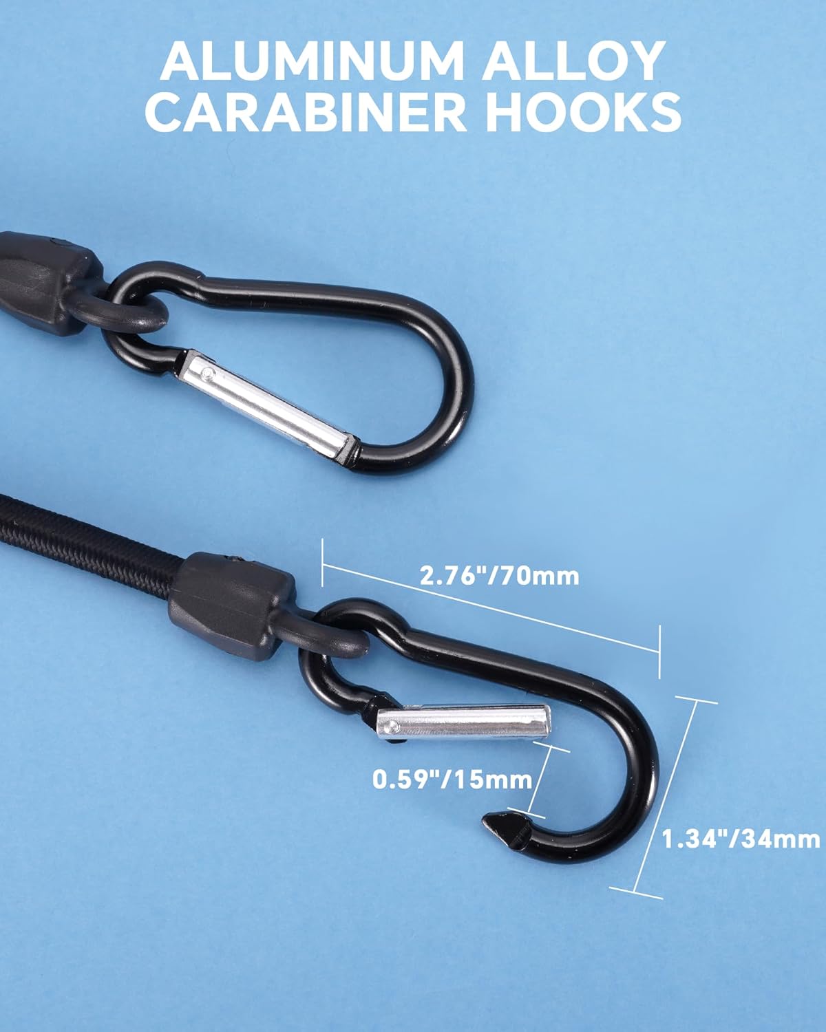 18-INCH SHORT CARABINER BUNGEE CORD – Only 18” length (excluding carabiner length), It can be stretched up to 36” in length. No more complaints about the carabiner bungee cord being too long. Perfect for tying down all of your small equipment and tools.